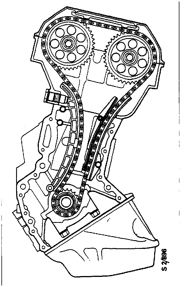 The chain tensioner is hydraulic and incorporates a spring and ratchet. It is fitted in the cylinder head and acts on the pivoting chain guide.