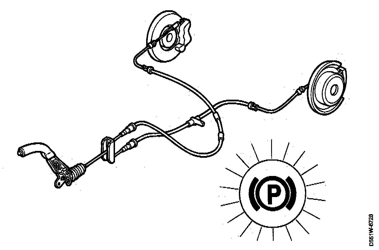 When the hand-brake is operated the handbrake lamp on the instrument panel comes on. When the handbrake is released, the return spring returns the levers and the brake shoes move to the brake off position.