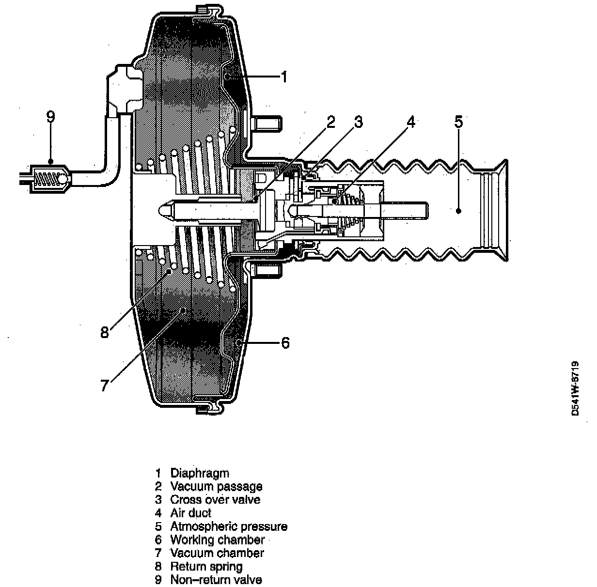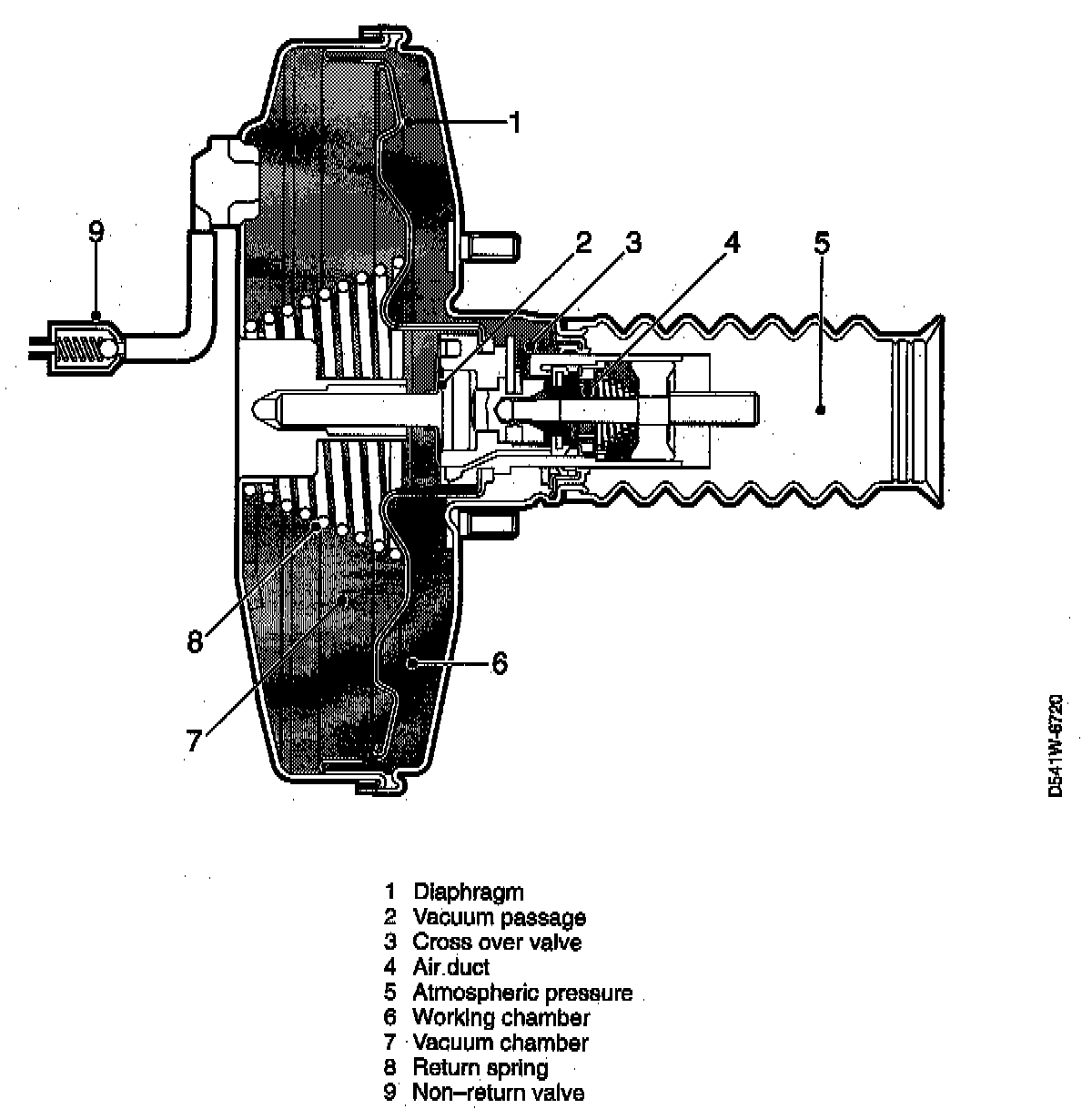 As the brake pedal is depressed the pushrod forces the valve piston and the diaphragm (1) forwards, causing the vacuum passage to close. When the push rod is pressed further, the valve piston opens a passage (4), which makes it possible for air at atmospheric pressure (5) to flow through the filter and in behind the diaphragm. As vacuum from the intake manifold acts in front of the diaphragm, the pressure difference causes the diaphragm (1) and the pushrod to the master cylinder to be moved forwards, resulting in reinforcement of the pedal force. When the pedal force ceases, the vacuum valve opens and air at atmospheric pressure on the back of the diaphragm flows across to the front and from there through the non-return valve (9) to the intake manifold. The opening for atmospheric air is closed and the return spring presses the diaphragm, valve piston and pushrod from the brake pedal back to the brake off position. The non-return valve prevents air at atmospheric pressure from flowing back from the intake manifold to the servo unit. The non-return valves only opens when the vacuum in the intake manifold is greater than in the servo unit.