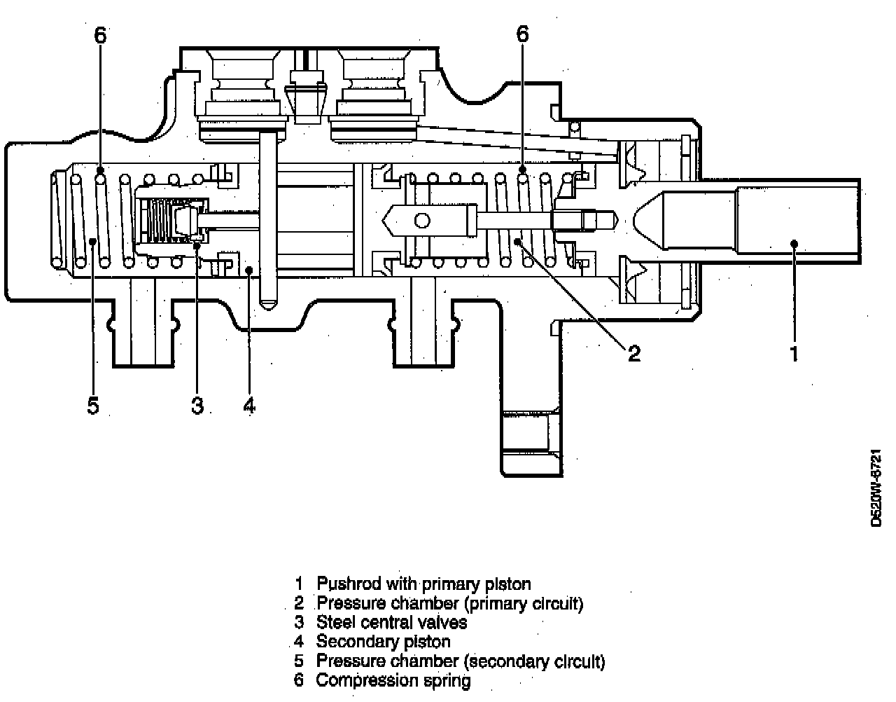 As the car as two independent brake circuits, it has a master cylinder with two independent pressure chambers. The master cylinder therefore incorporates two pistons: a primary piston (next to the brake pedal) and a secondary piston and also return springs for these. The secondary piston has a steel center valve that opens the ducts to the brake fluid reservoir in the brake off position.