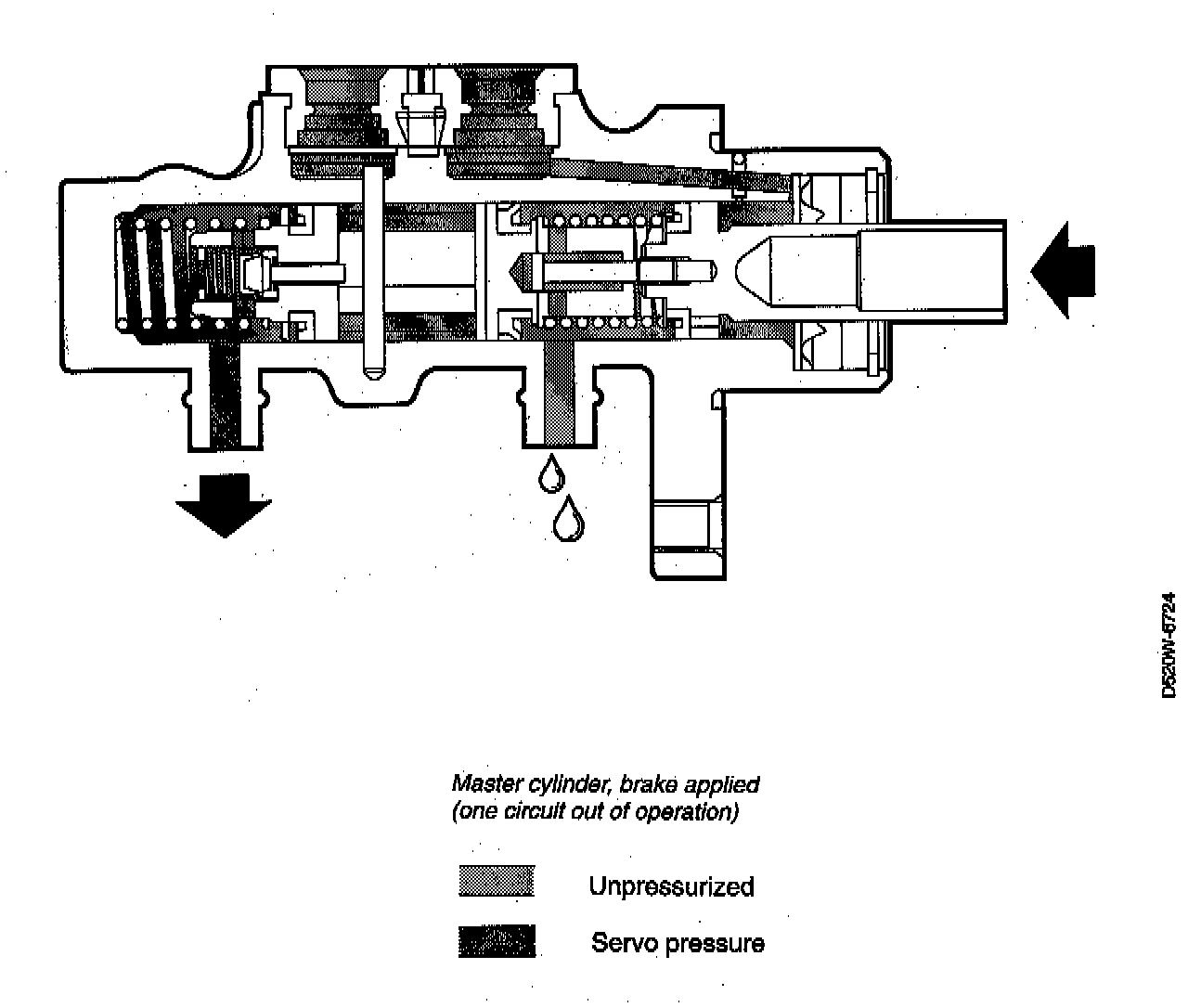 If there is a leak in the secondary circuit the secondary piston is pushed forwards and will touch bottom in the master cylinder. In both cases a longer pedal movement is required to accomplish the desired braking action.