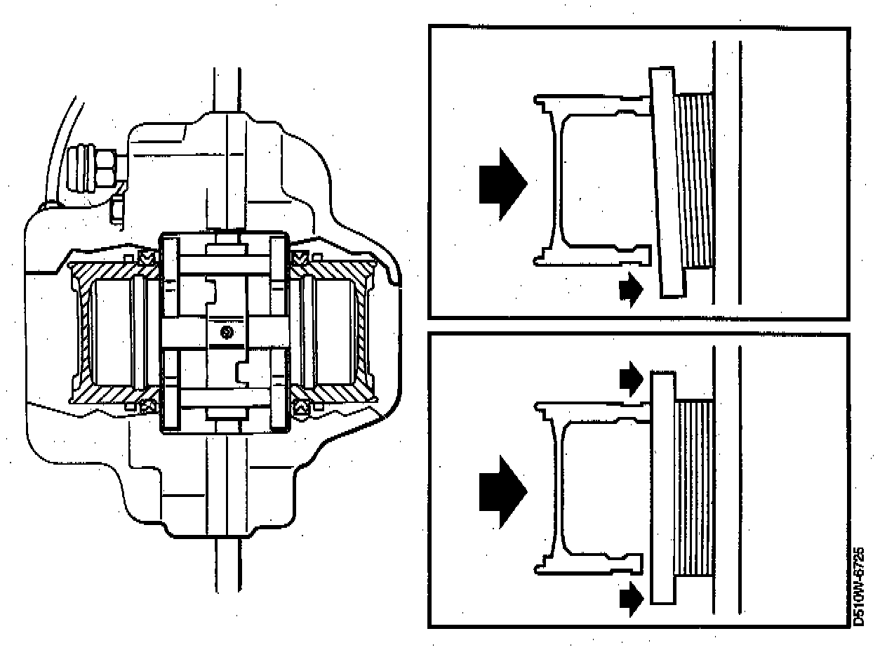 When the brake is operated the hydraulic pressure acts partly straight to the brake cylinder and partly against the brake cylinder walls. the brake piston forces the inner brake shoes against the brake disc. Meanwhile the hydraulic body slides across so that the outer brake shoes press against the brake disc. When the hydraulic pressure ceases the brake piston in each brake cylinder returns to the brake off position with the aid of the piston seal.