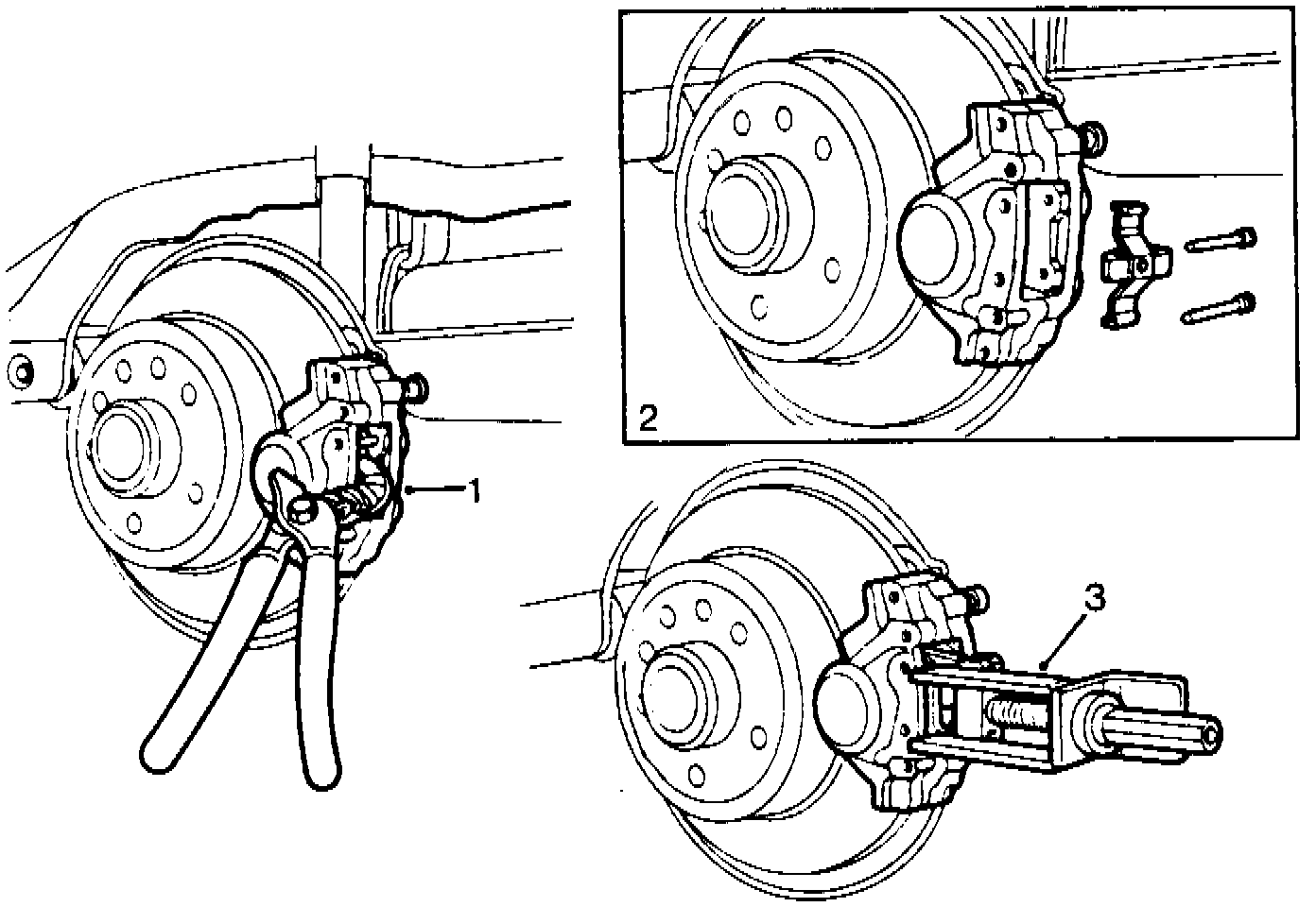 3. Remove brake pads. If pads are jammed, use brake pad remover tool 89 95 771, or equivalent (3), to remove.