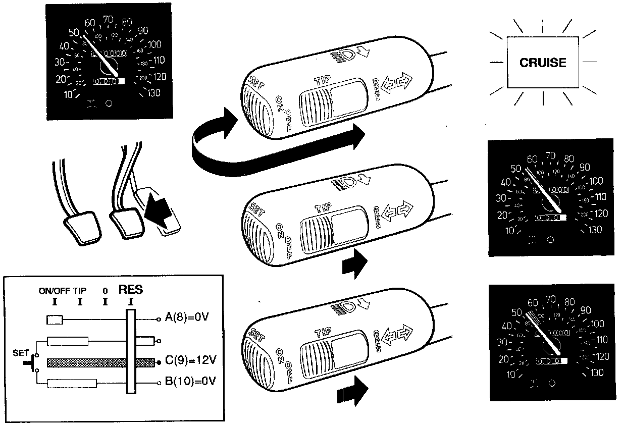 In the TIP position, current is supplied to connections B and C of the control module and the Cruise Control system is disengaged.