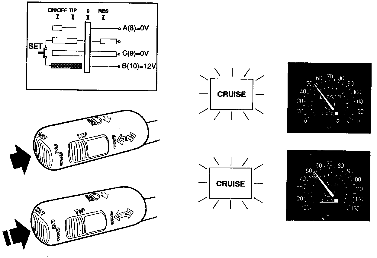 SET/+: At the end of the direction-indicator stalk is a spring- loaded SET/+ push-button. When this button is depressed, current is supplied to connection B of the control module. This button has two functions: