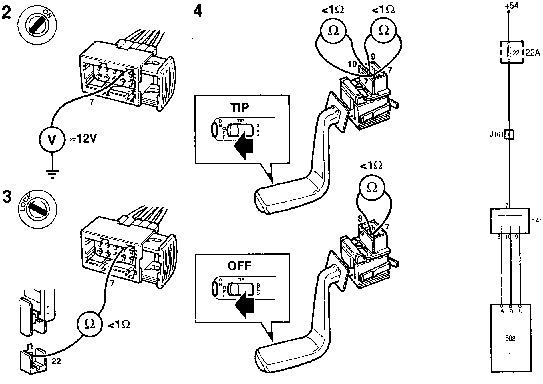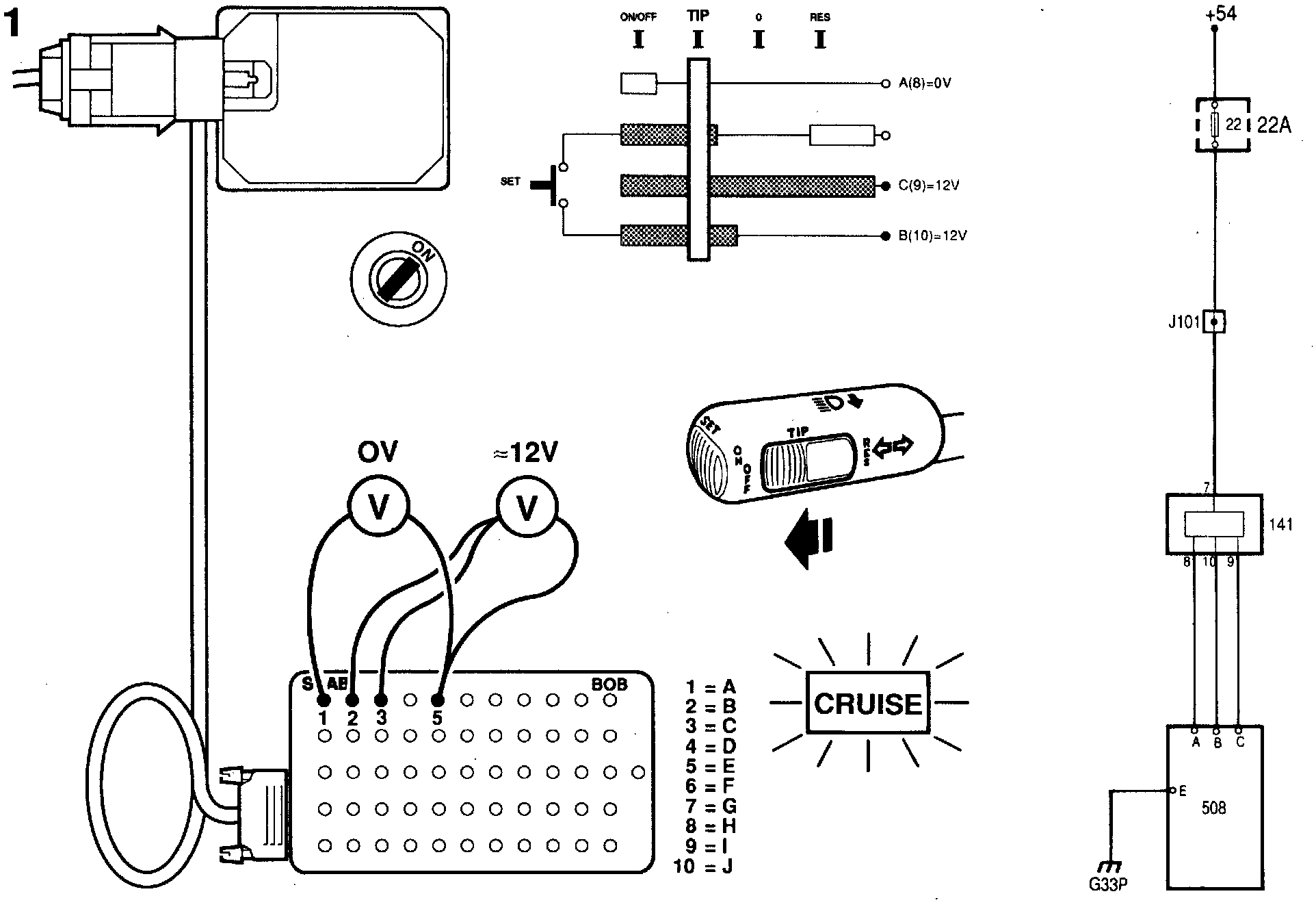 1 Connect the BOB and check that a 12 V supply is present across connection B of the Cruise Control and a good ground, and also across connection C of the Cruise Control and a good ground. Also check that there is no voltage (0 V) across connection A and a good ground when the TIP button is held in the depressed position.