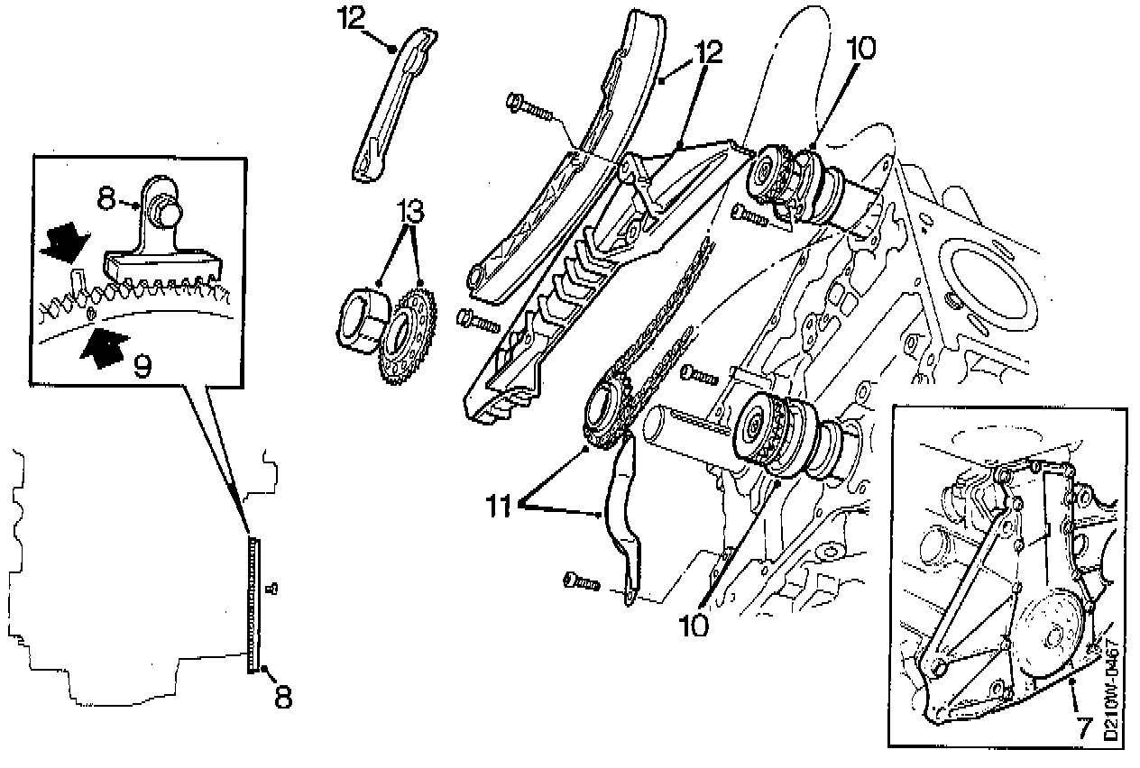 12. First install the fixed chain guide, which is common to the timing chain and balance-shaft chain, and then the pivoted chain guides for the timing and balance-shaft chains.