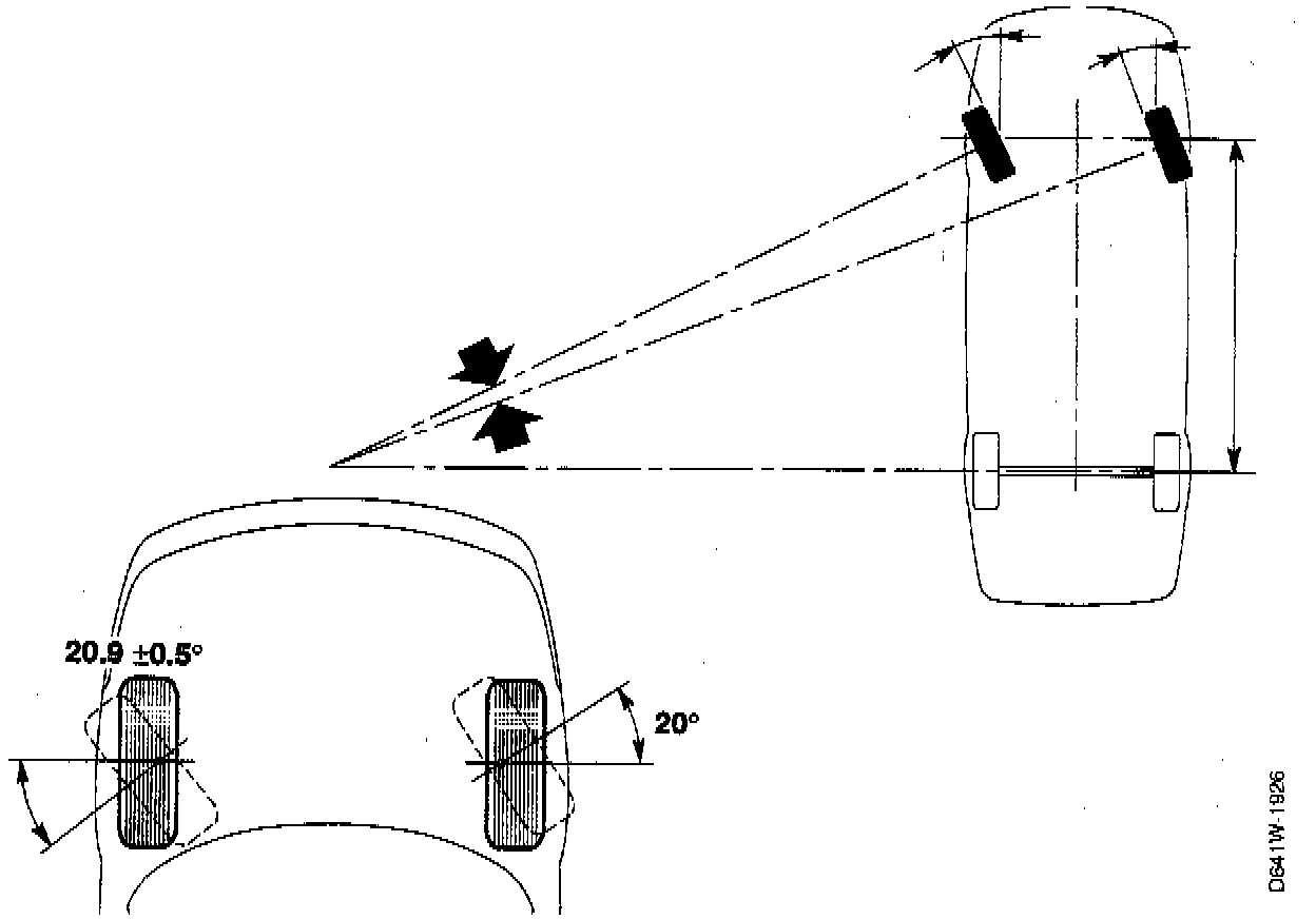 Camber refers to the angle formed between the wheel and the vertical. If the wheel leans outwards, the camber angle is said to be positive (+); if it leans inwards, the angle is said to be negative (-). Wheel camber on the Saab 900 is negative.