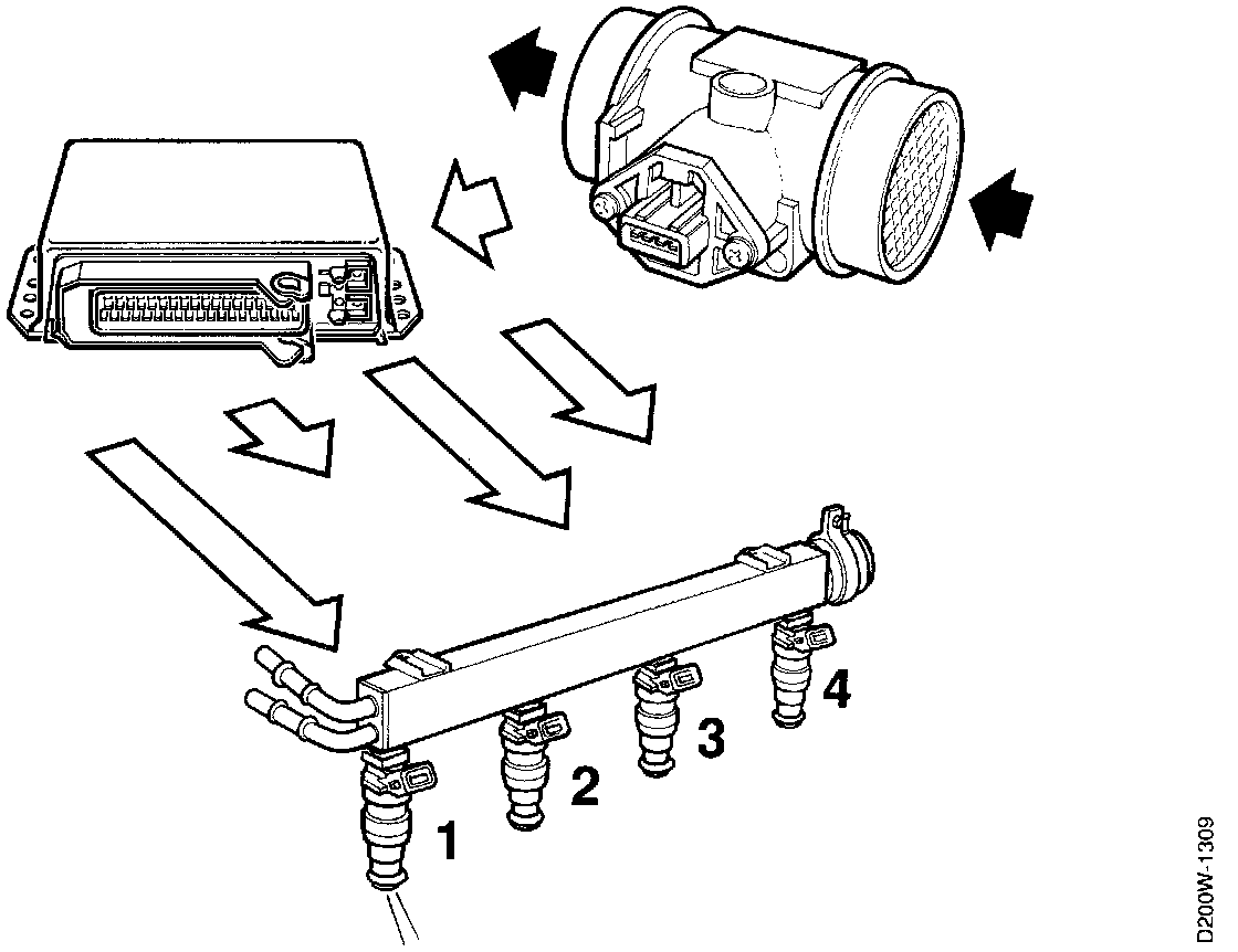 On the basis of the control module's input signals from the oxygen sensor, mass air flow sensor, crankshaft position sensor and other sensors, the exact amount of fuel to be injected into the cylinder is calculated. This is done by varying the length of the grounding signals between 3 and 15 ms. In conditions of extreme cold, i.e. below -3O°C (- 22°F) signal duration may increase to 22O ms. The system has no cold-starting valve.