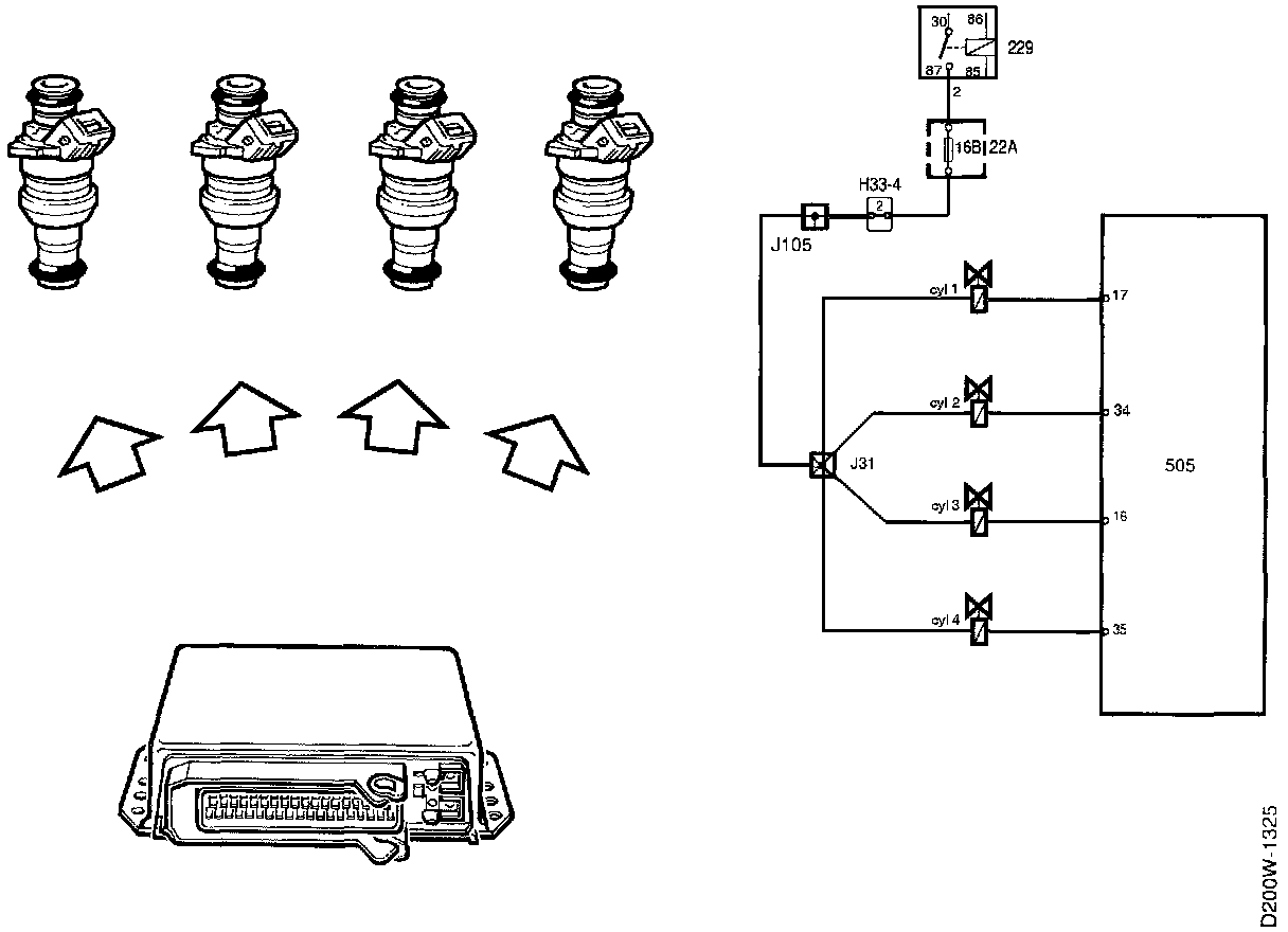 While the starter motor turns the engine over and at temperatures below 20°C (68°F), the control module sends signals to all the injectors simultaneously to facilitate starting (only during the first injection of fuel).
