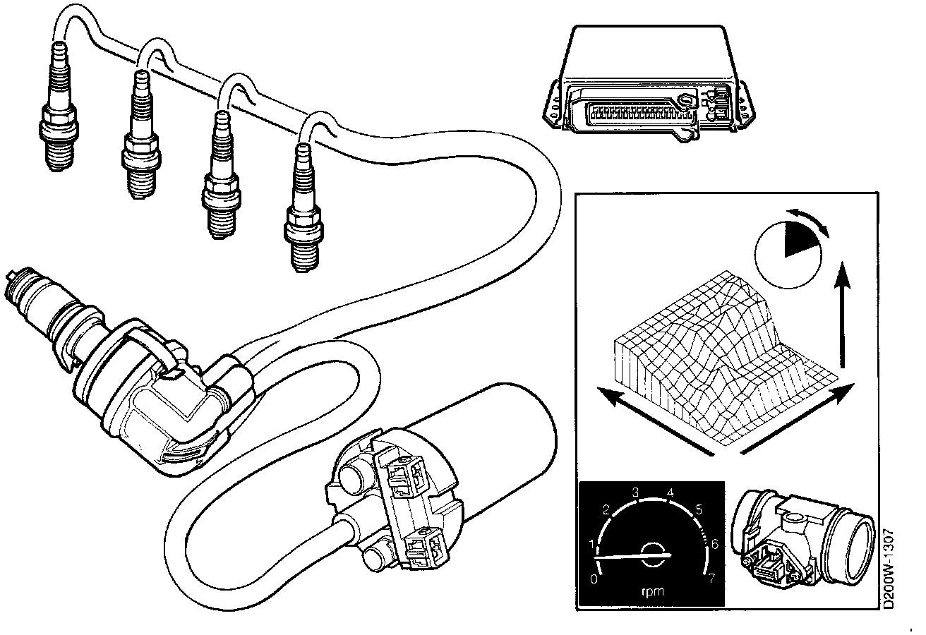The ignition system of the MOTRONIC 2.10.2 is a conventional electronic system with ignition coil, distributor with rotor arm, distributor cap and HT leads. The firing order is 1-3-4-2.
