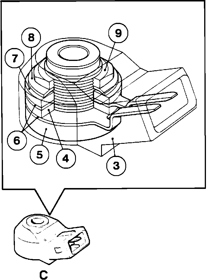 The knock sensor (C) consists of a housing (3) a piezoelectric crystal (4) mounted on a threaded sleeve (5) between two connector strips (6). One side of the assembly is fitted with a damping weight (7) and spring washer (8) secured by a nut (9).