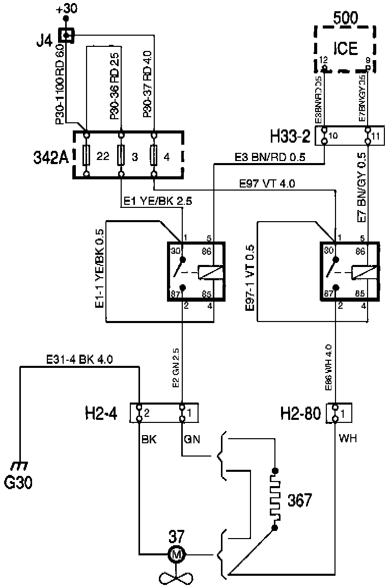 The Integrated Central Electronics (ICE) module starts and stops the cooling fan at preprogrammed coolant temperatures, see illustration, by grounding the relays.
