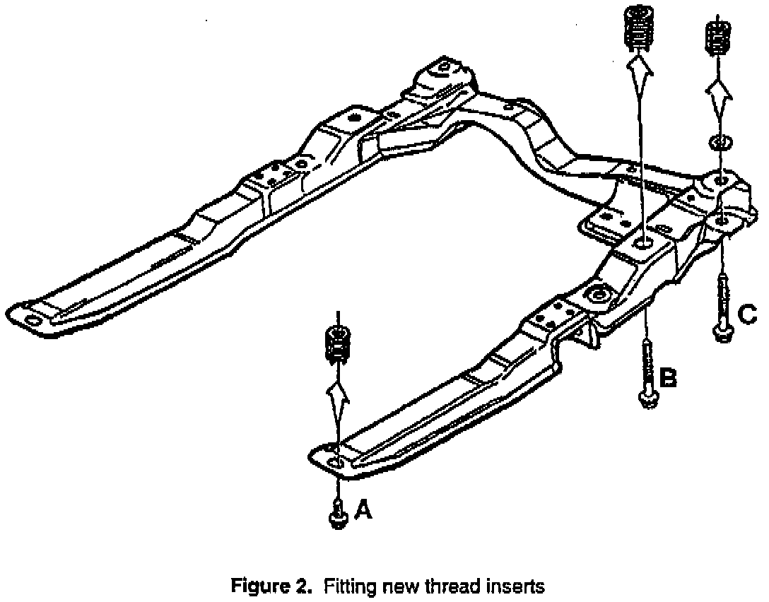 It is possible when removing and/or fitting the subframe for the threads holes in the body for the subframe mountings to become damaged. Should this occur, follow the direction below to rectify this. Helicoils listed below are equipped with special locking pins. Helicoils without locking pins must not be used.