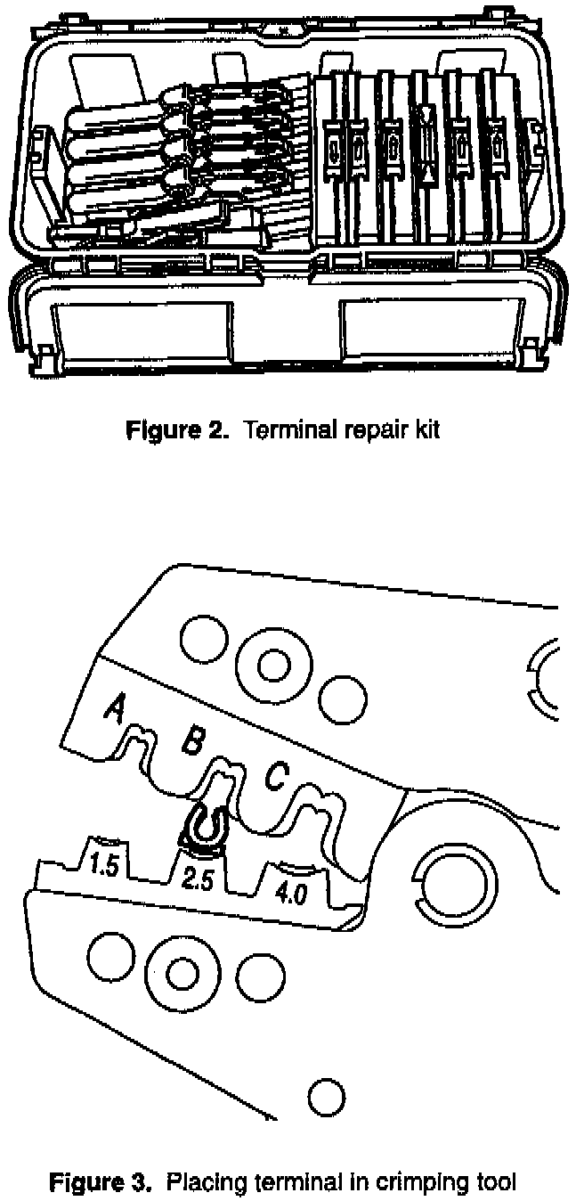 It is absolutely essential to use the right terminal with the right crimping tool to ensure proper repair. It is also extremely important to ensure that the crimping tools are used only on terminals from the box having the same color as the tool.