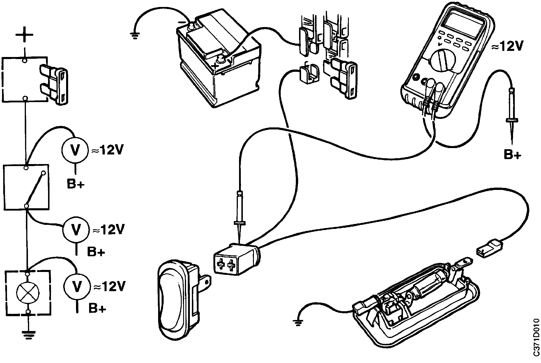 2. Connect one of the voltmeter's leads to B+.