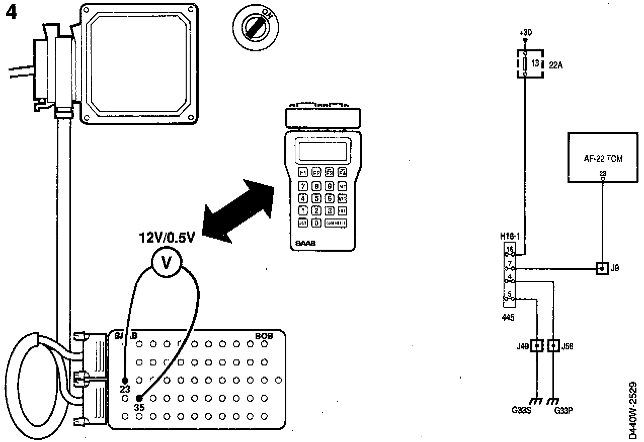 2. With the ignition switched OFF, connect a BOB between the Transmission Control Module (TCM) and the wiring. Check the TCM feeder voltages and ground connections and remedy any faults. Connect a voltmeter as follows with the ignition in drive position: