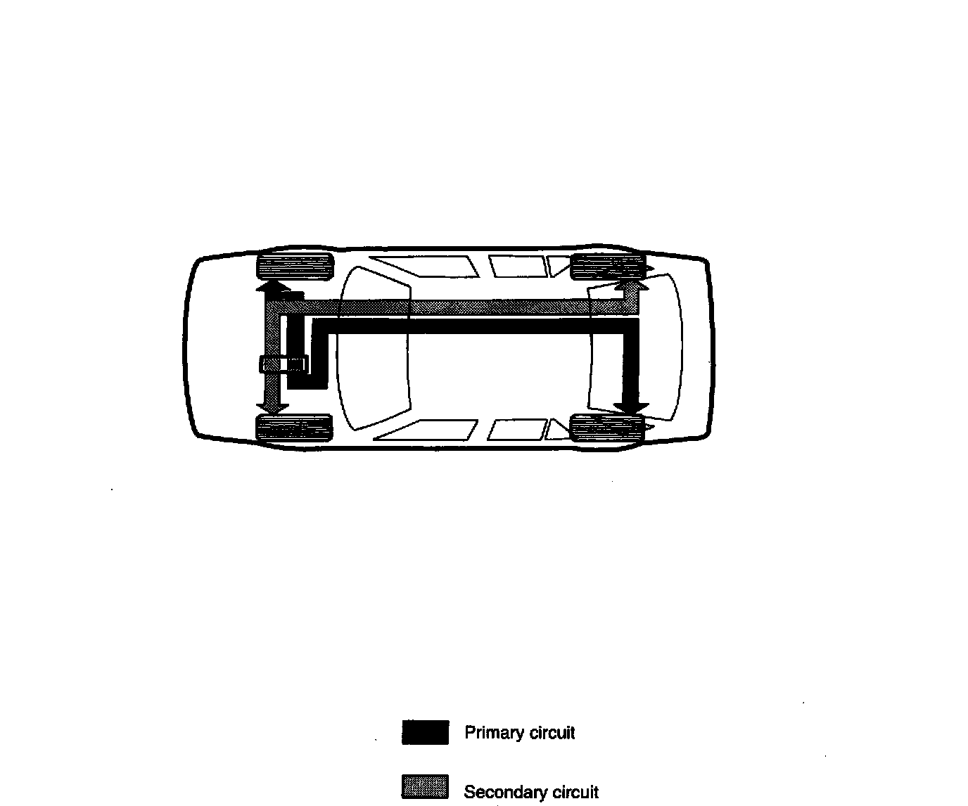 The hydraulic brake system consists of two separate diagonal brake circuits. One circuit is for the righthand front wheel and left-hand rear wheel (primary circuit) and the other circuit is for the left-hand front wheel and right-hand rear wheel (secondary circuit). With the circuits split in this way, if one circuit should fail because of leakage, for instance, the other circuit still remains operative and always provides at least 50% of the total braking power.