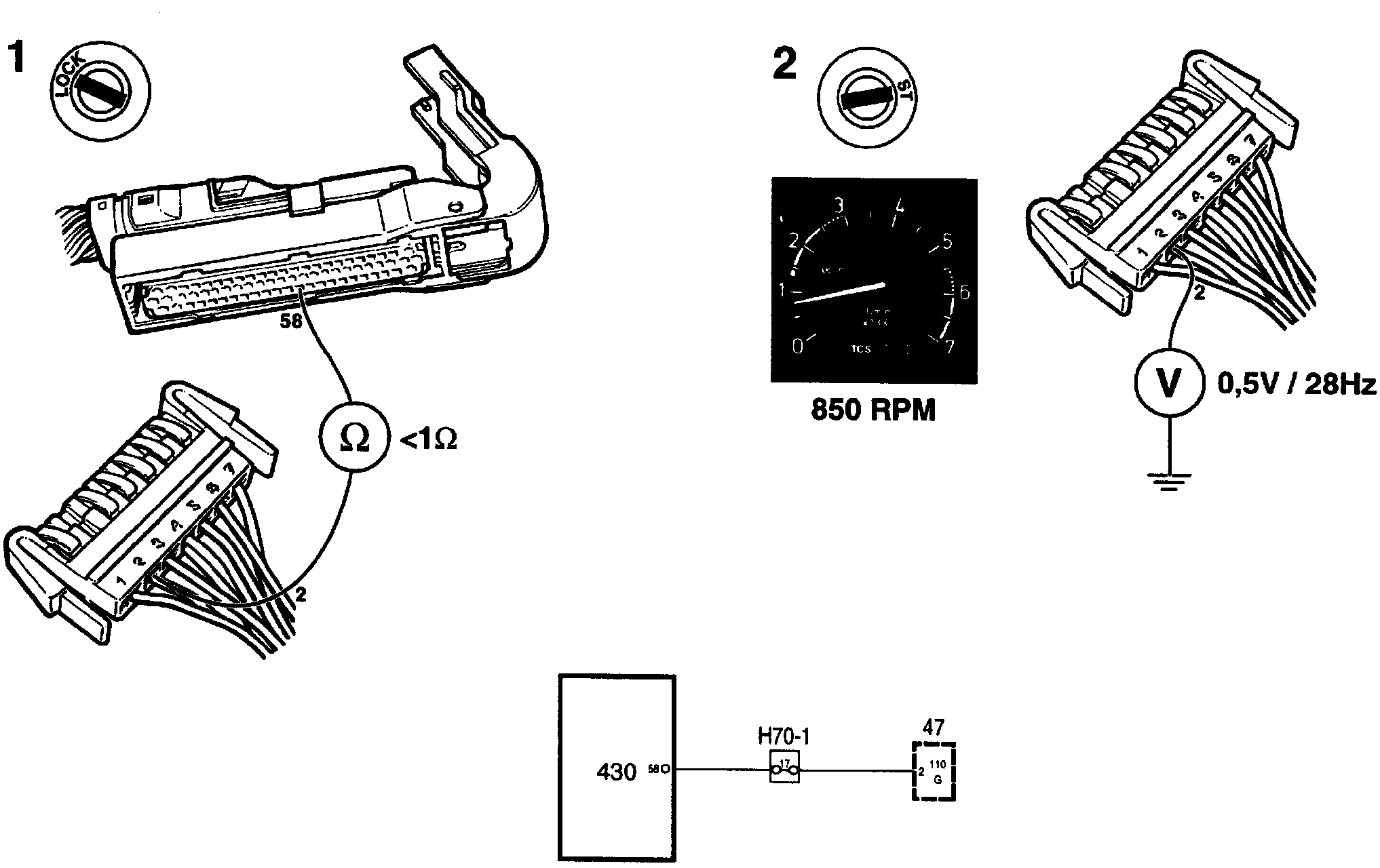 At idling speed, about 850 rpm, a reading of about 0.5 V /28 Hz should be obtained.