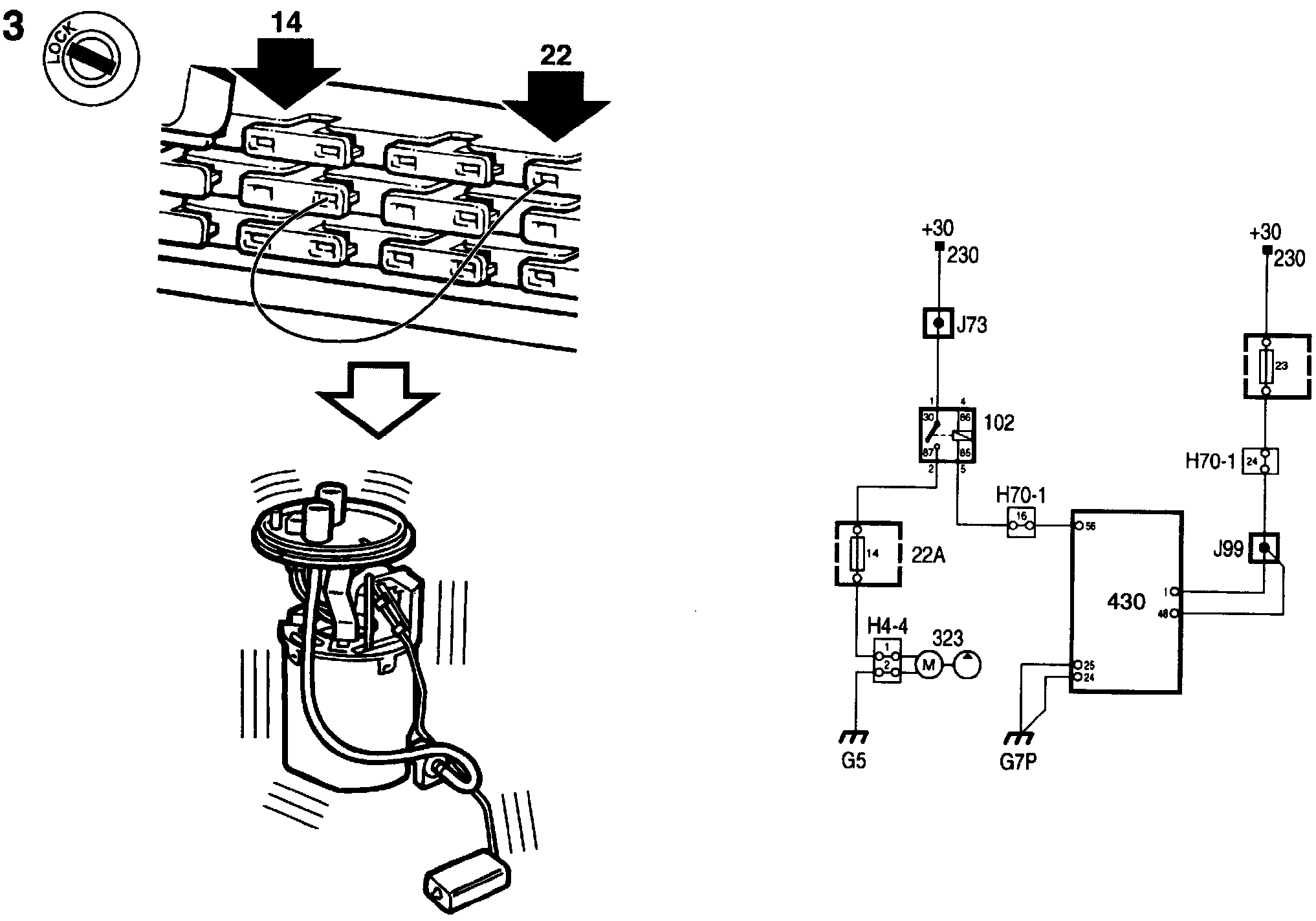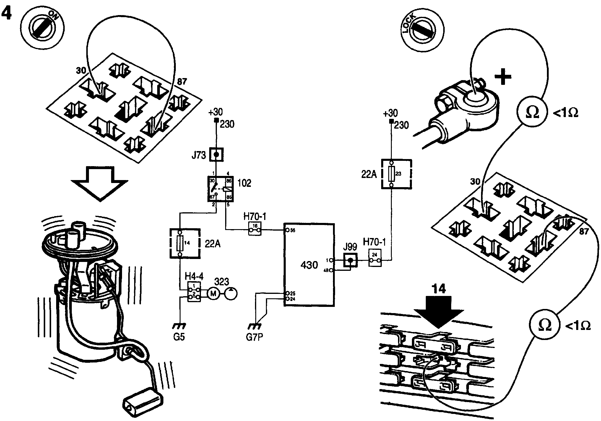 If the fuel pump does not work, check the lead between pin 87 and fuse 14 and also the lead between pin 30 and battery positive and take remedial action if necessary.