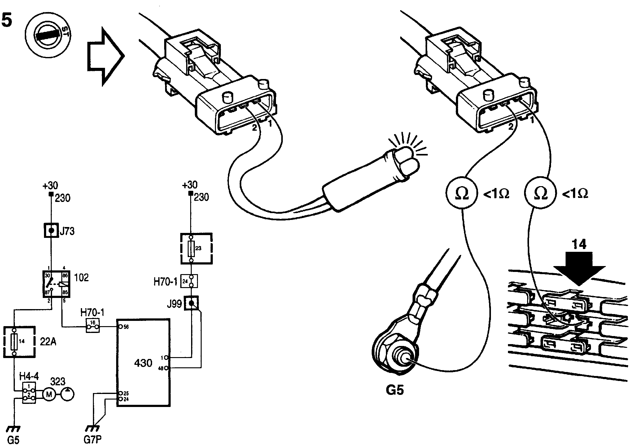 If the test lamp does not flash, first check the lead between pin 2 and grounding point G5 and then the lead between pin 1 and fuse 14 and take remedial action if necessary.