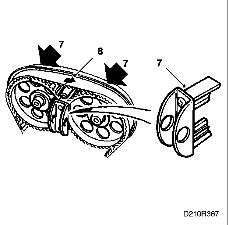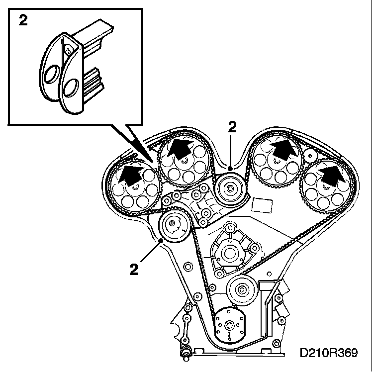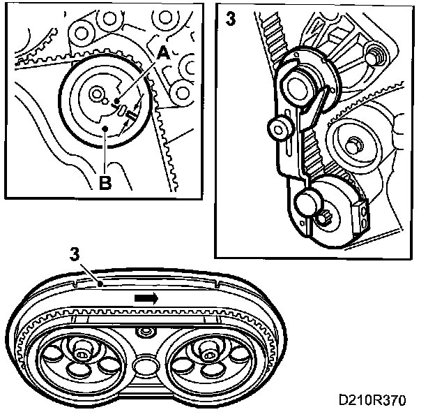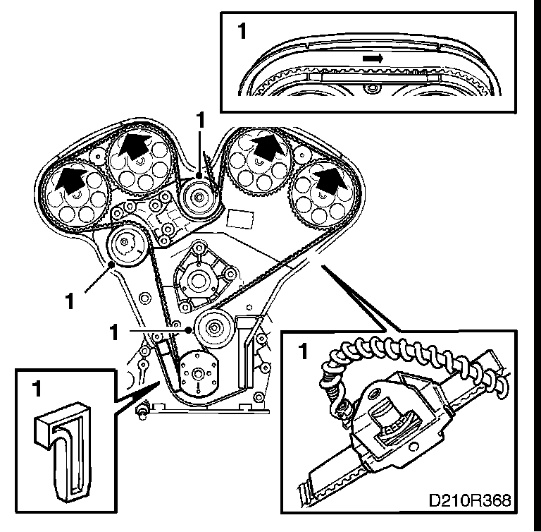 1. Fit the toothed belt according to the marked direction of rotation. Use setting tool 83 95 006 to keep the belt in place and adjust the tensioning roller loosely by hand to prevent the belt from jumping off. Adjust anticlockwise.