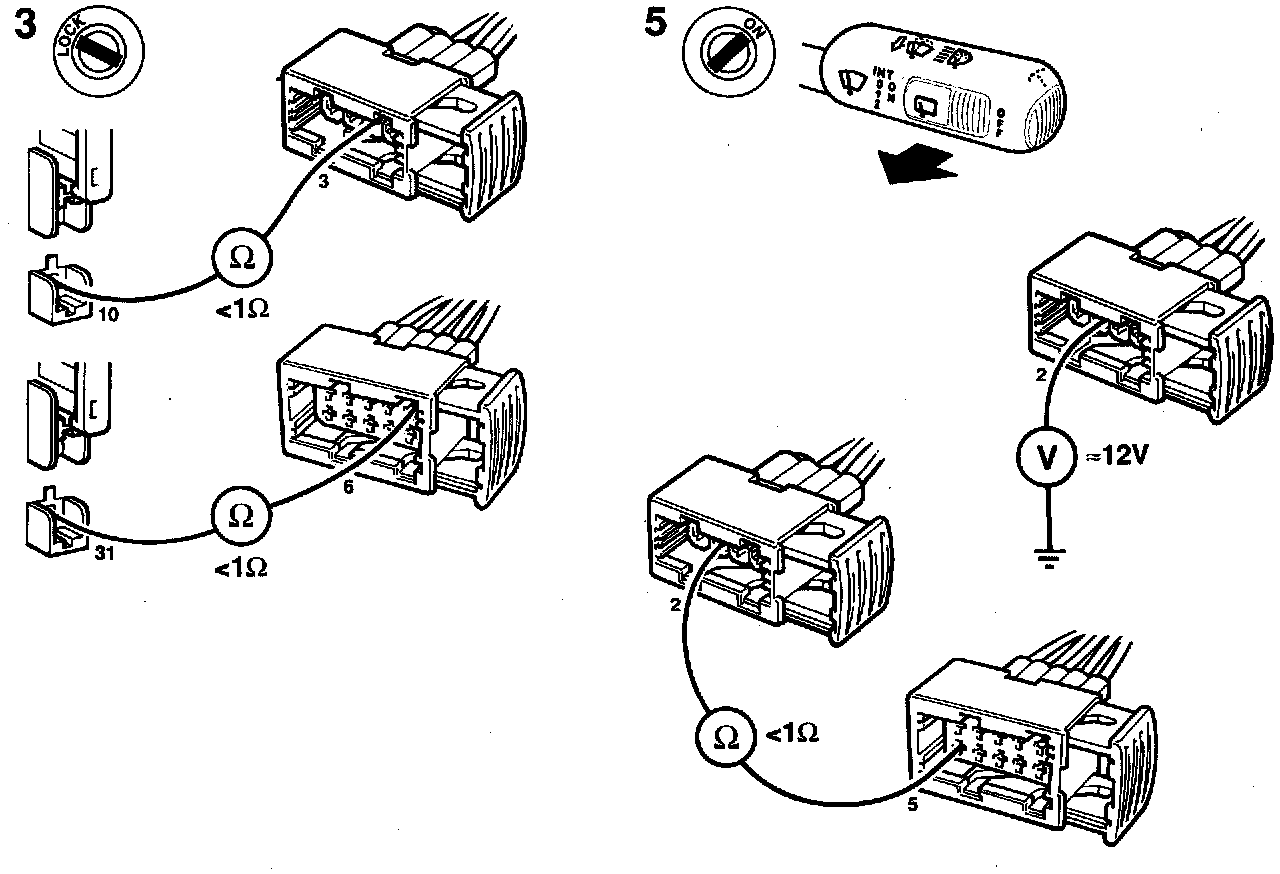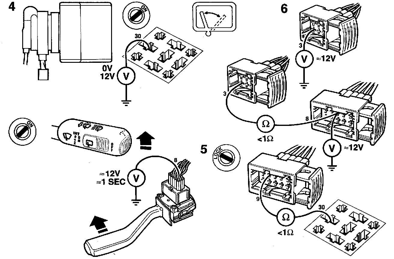 4 Check the grounding by taking a reading between pin 1 of the rear window wiper connector and a good grounding point.