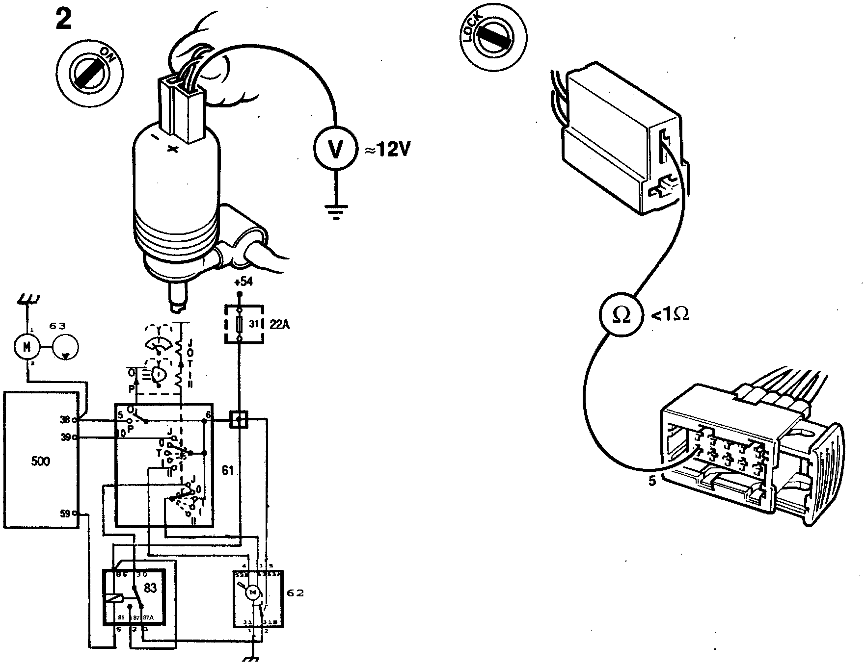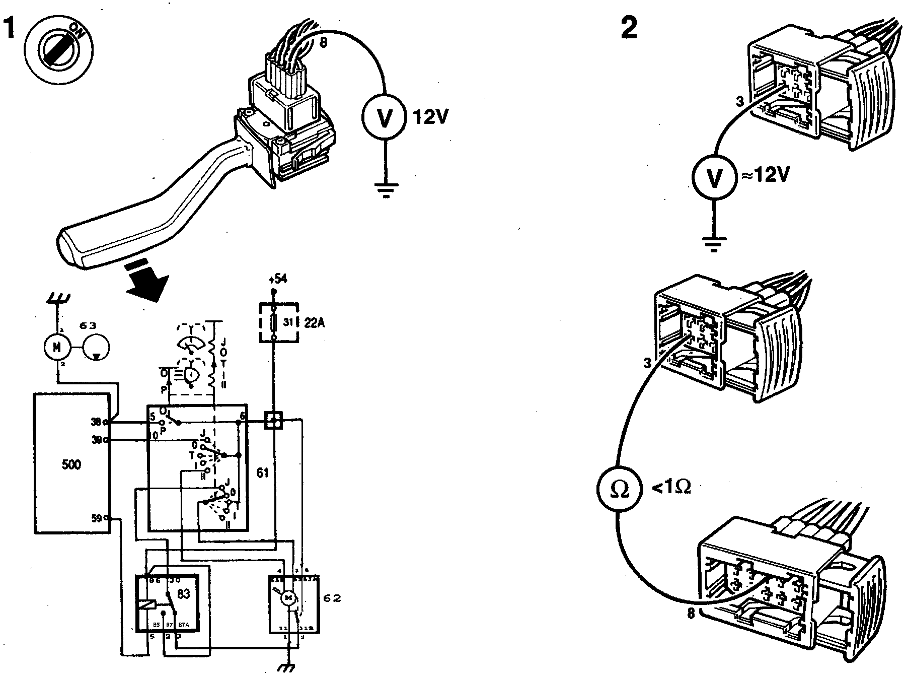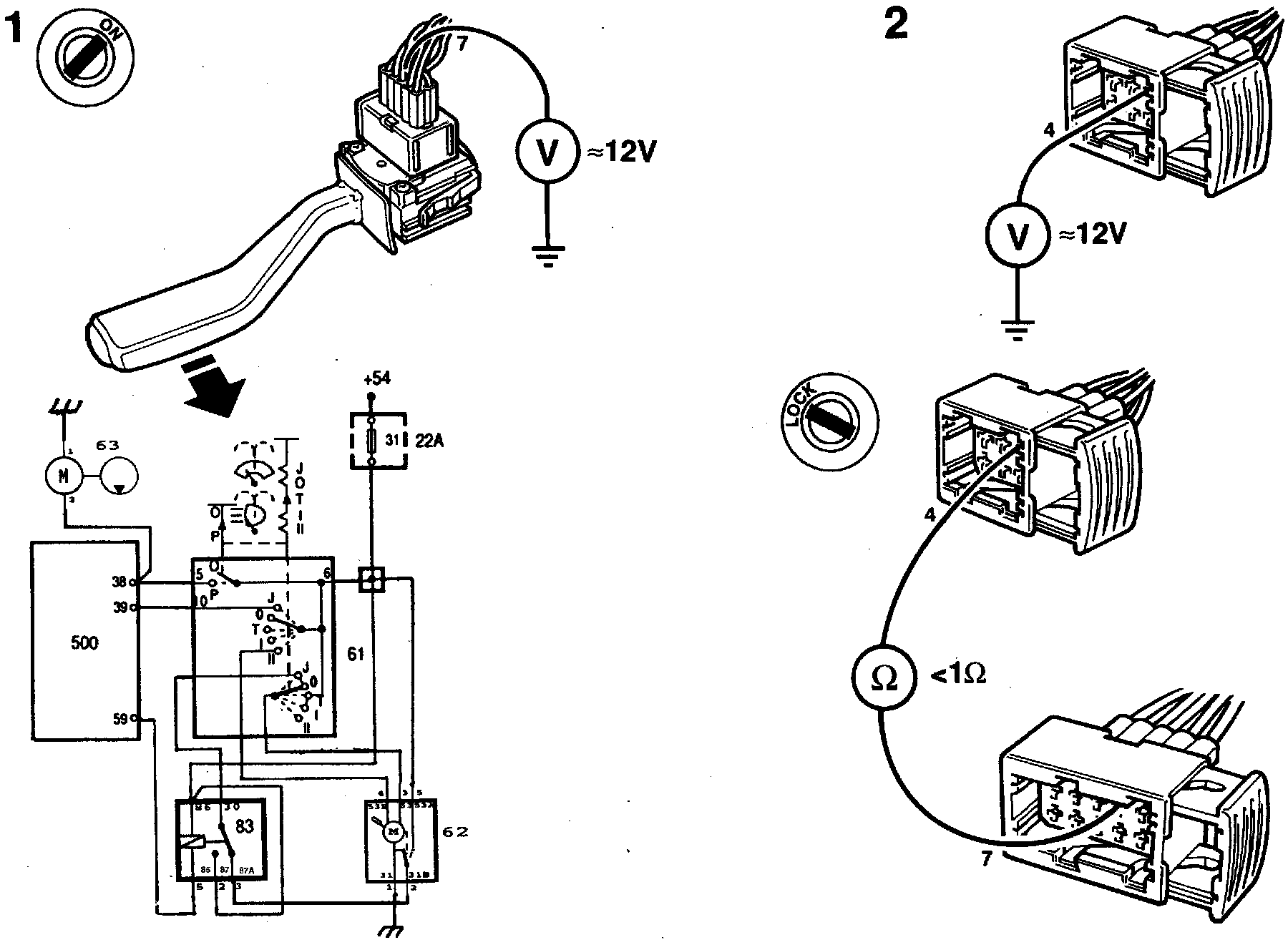 If this is not the case, check that a 12 V power supply is present on pin 2 of the switch when in the ON position. If no power supply is present, change the windshield wiper switch.
