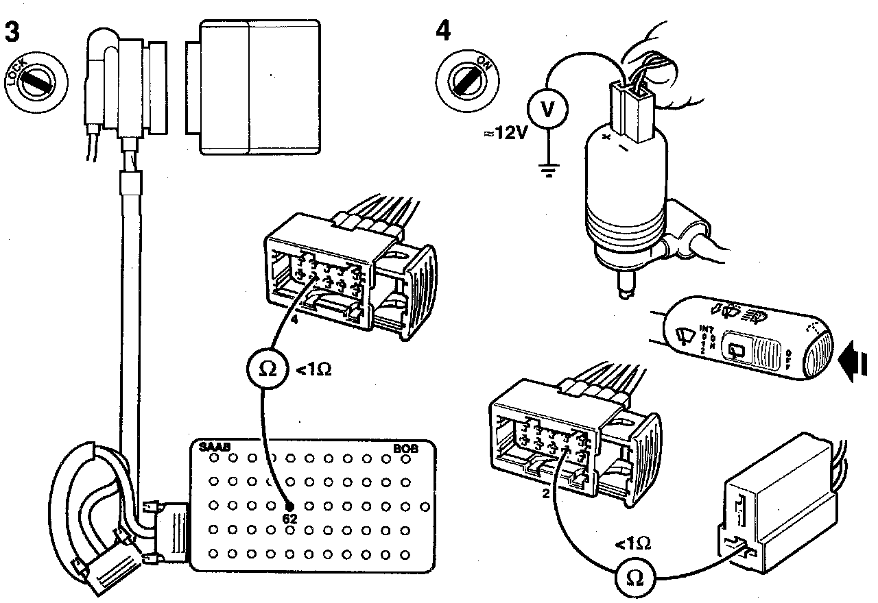 If no power supply is present, check the wiring between pin 4 of the switch connector and the washer pump's positive (+) terminal for continuity/shorting.