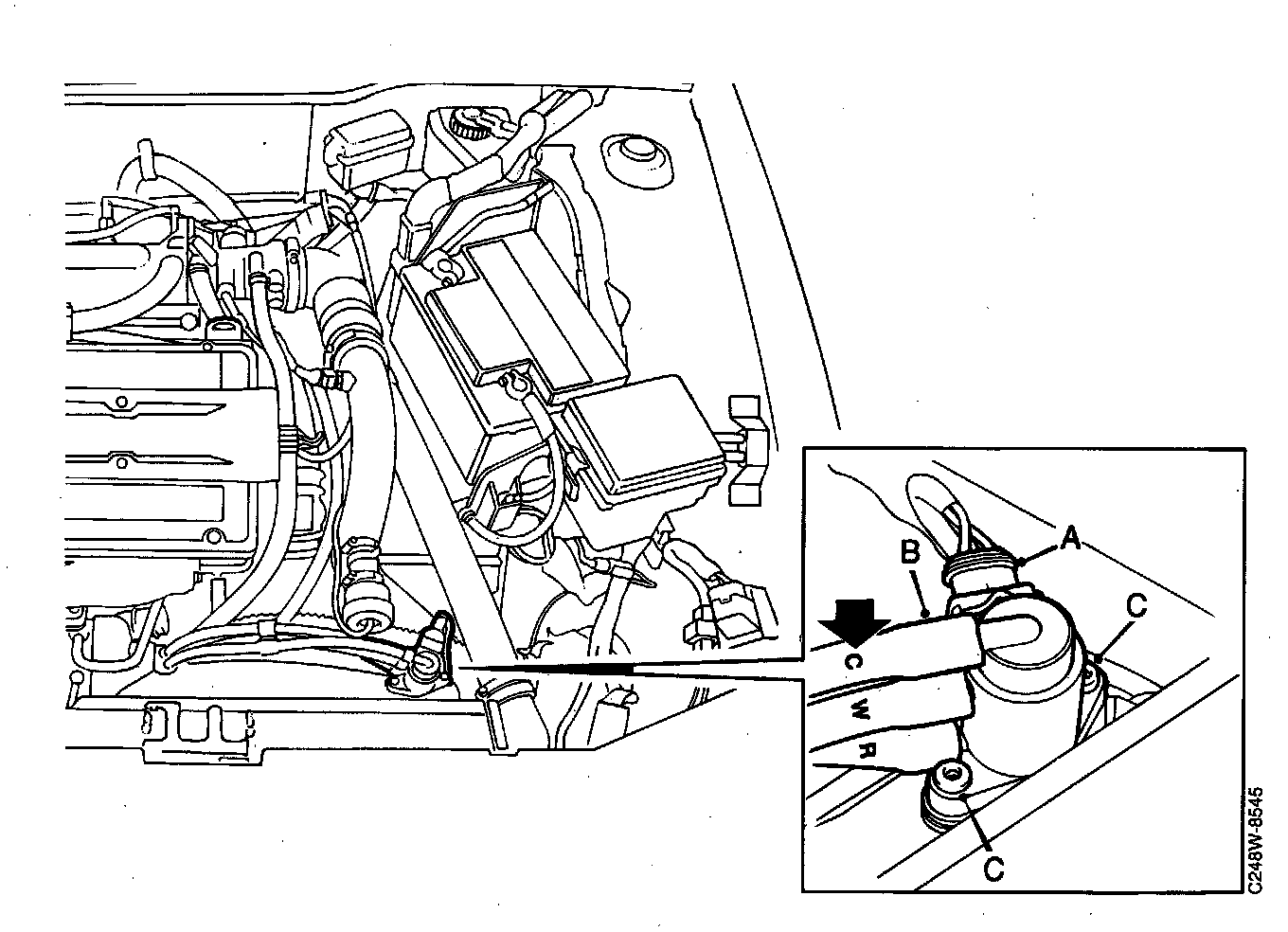 2. Fit the control hoses back in place on their respective unions C, R, W, as shown (B).