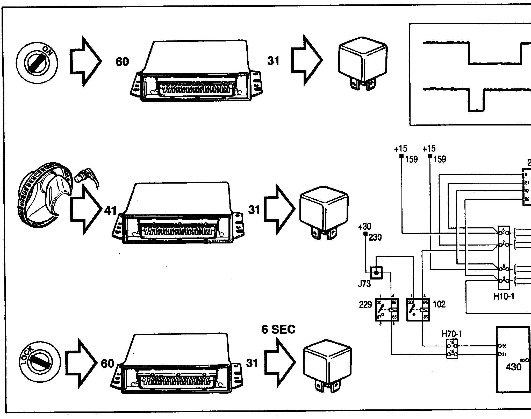 If the engine is started and the ignition then switched off for more than 45 seconds, the main relay will operate for about 6 seconds to allow for pre-injection next time the ignition is switched on. On the other hand, if the ignition is switched on without the engine being started, pre-injection will not take place again unless the ignition has been switched off for 15 minutes.