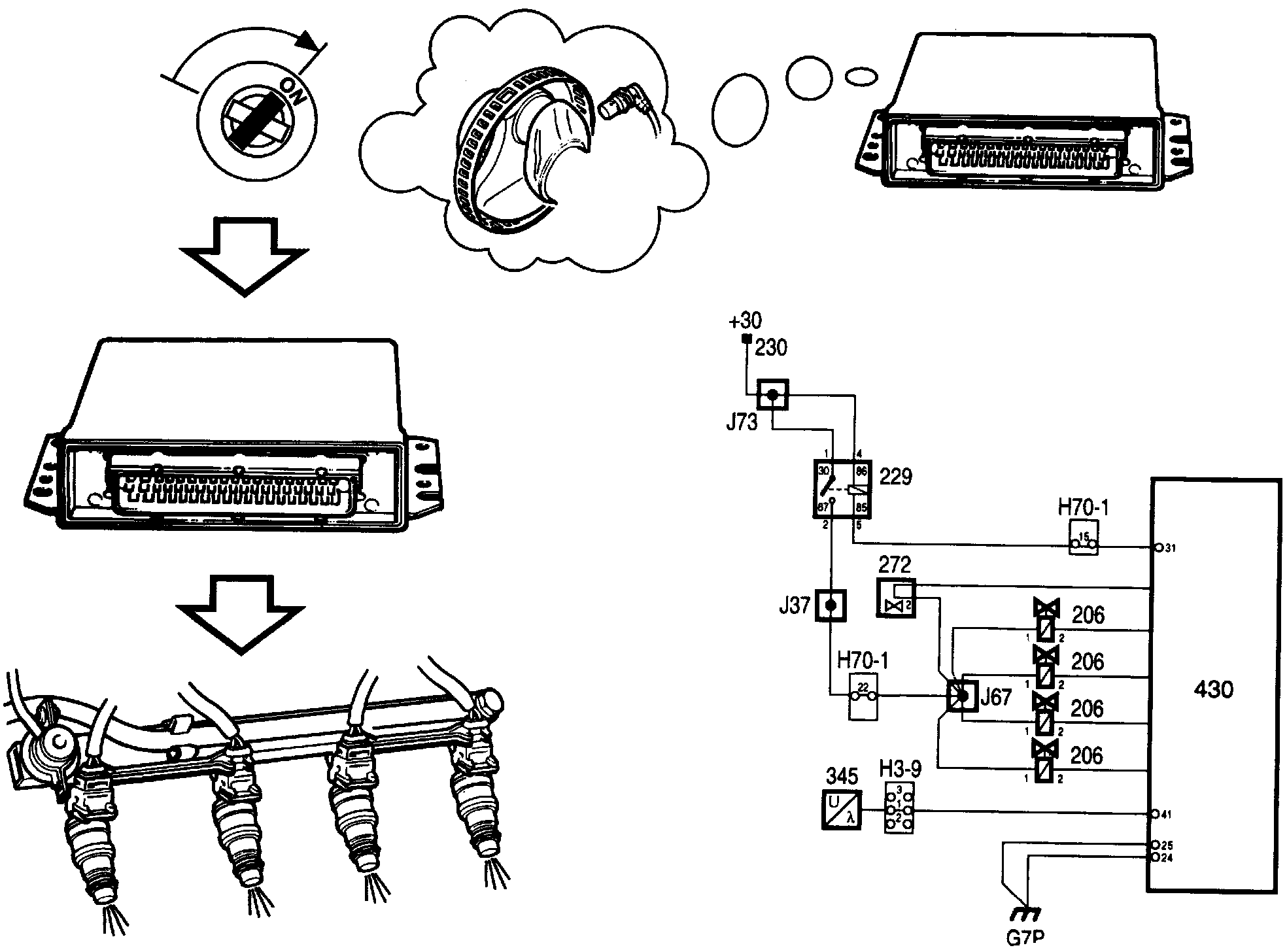Switching on the ignition activates the control module and causes pre-injection to take place under certain conditions. The control module then waits for pulses from the crankshaft position sensor.