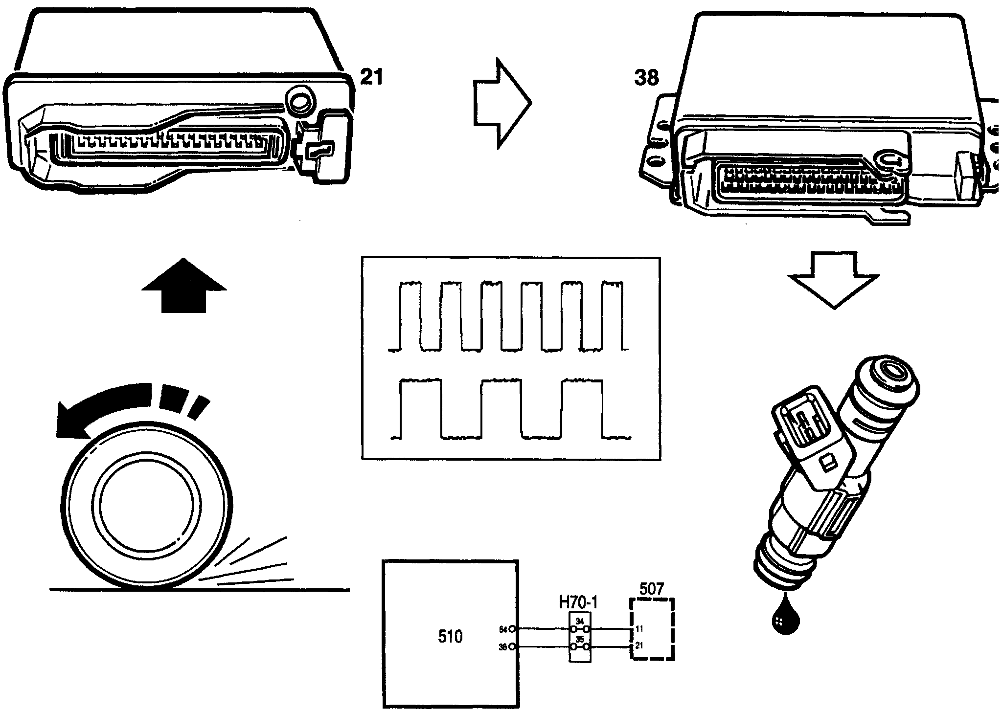 When the Traction Control System (TCS) is activated, the TCS control module puts out a 62 Hz PWM signal from pin 21. The PWM signal is received on pin 38 of the Motronic control module which then disconnects the full load enrichment function.