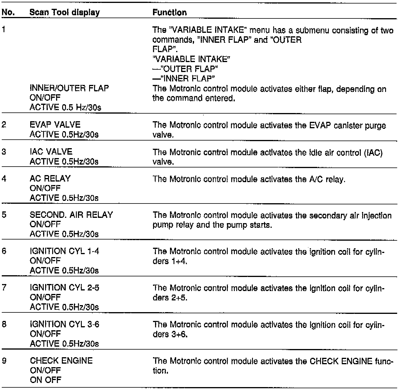 When a system function is activated with the Scan Tool, the Motronic control module is made to do something that it would not otherwise do in the course of its normal operation. This may cause diagnostic trouble codes to be generated in other systems which are dependent on the Motronic system.
