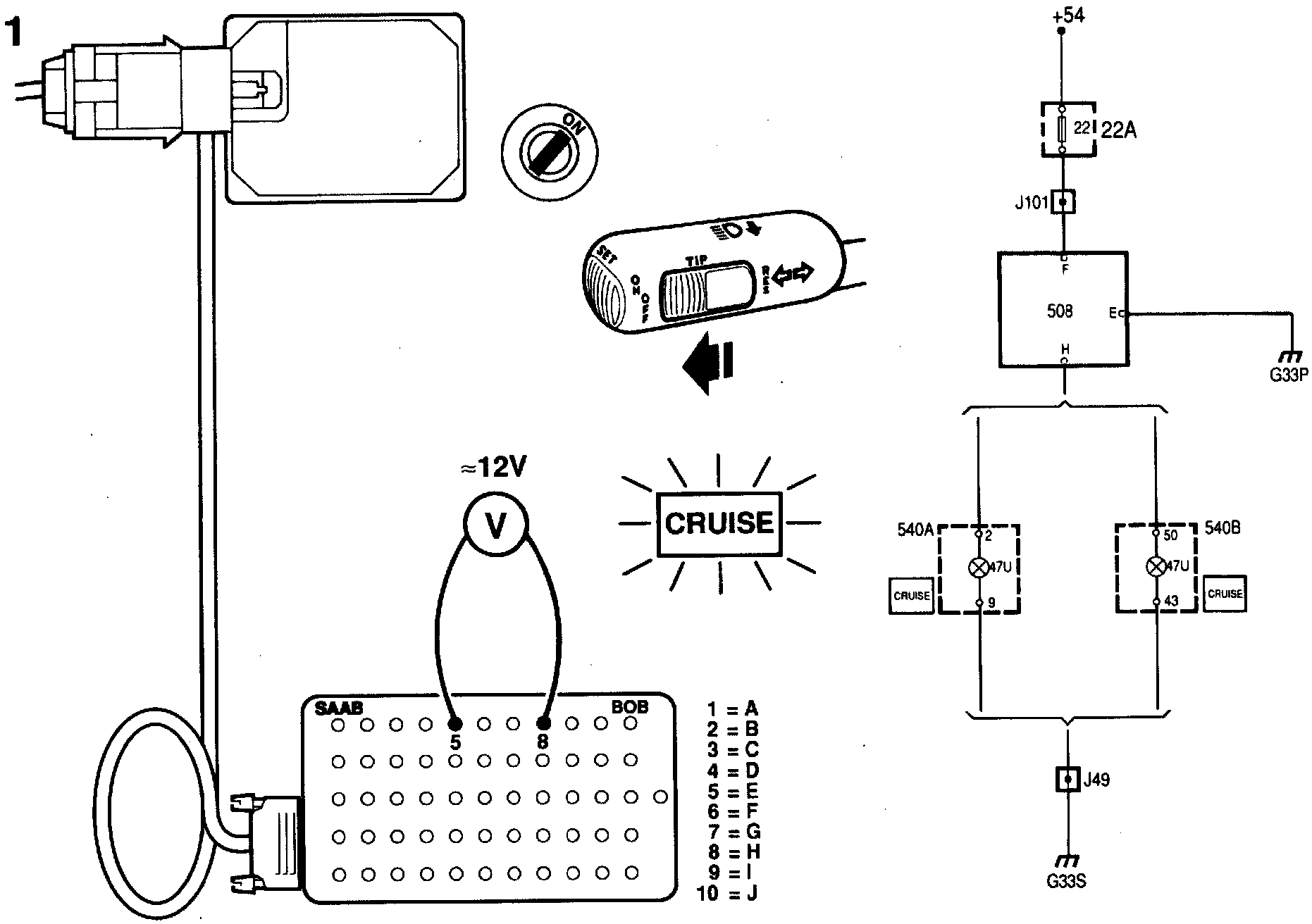 1 Check that a 12 V supply is present across pin 8 (H) of the Cruise Control connector and a good earth when the Cruise Control system is activated.
