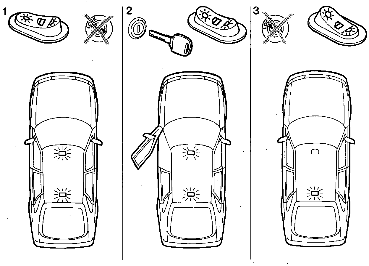 Position 3: (rear position) Only the rear roof lamp comes on, regardless of the position of the ignition switch, whether the ignition key is inserted or not, and regardless of whether the door is open or not.
