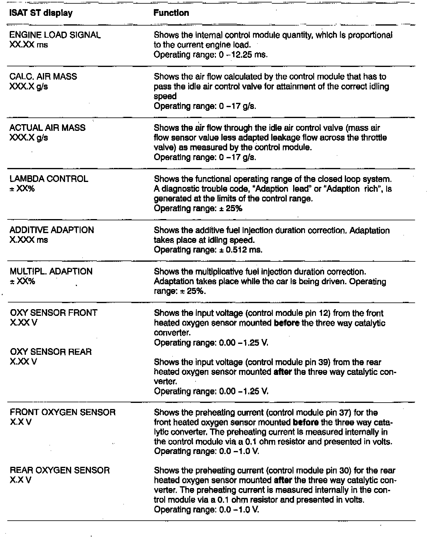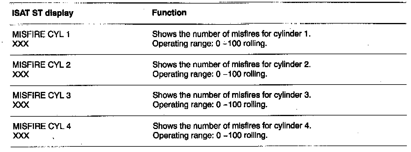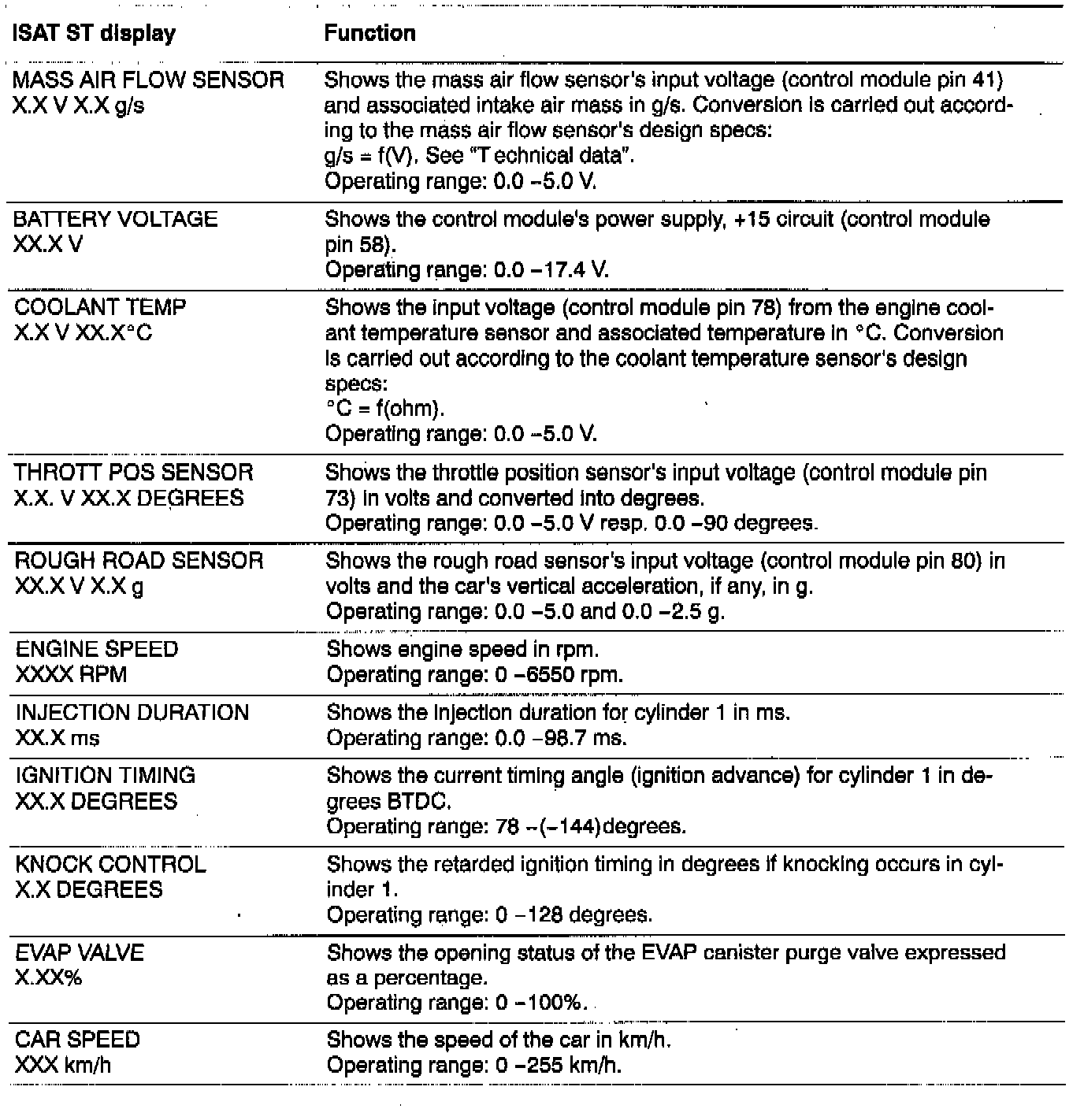 The Intellegant Saab Tester (ISAT) scan tool displays below are presented in the same order as the commands listed under READ FUNCTIONS in the ISAT scan tool menu structure.
