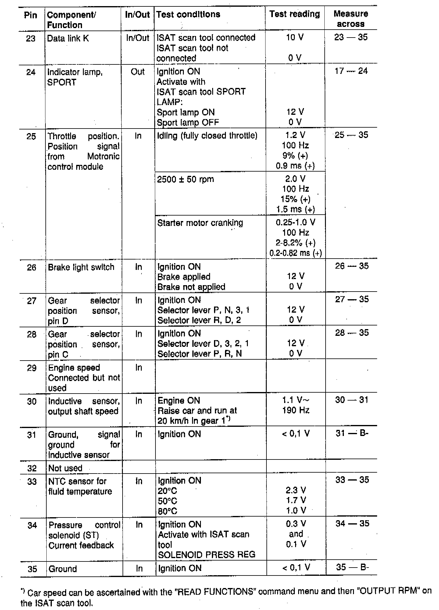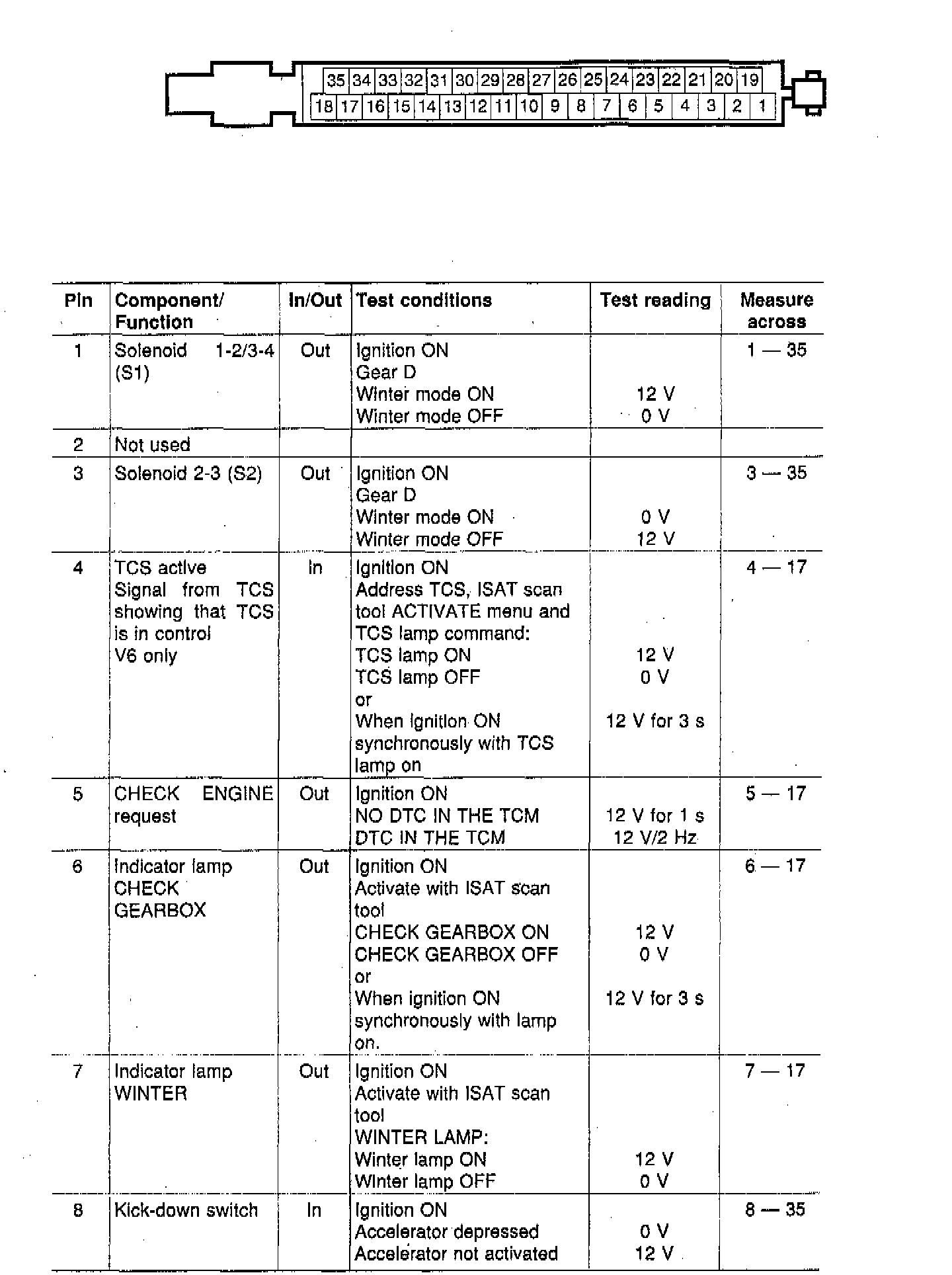 - A reading taken across the relevant control module pin and ground (pin 35) will then show less than 1.5 V, which is indicated in the table shown.