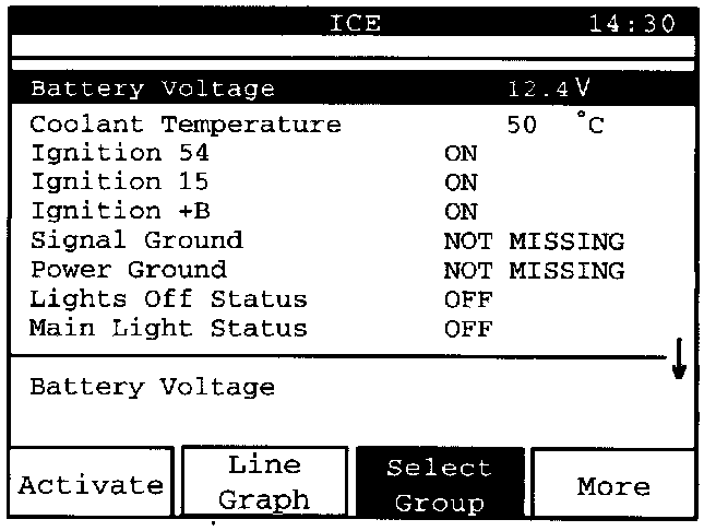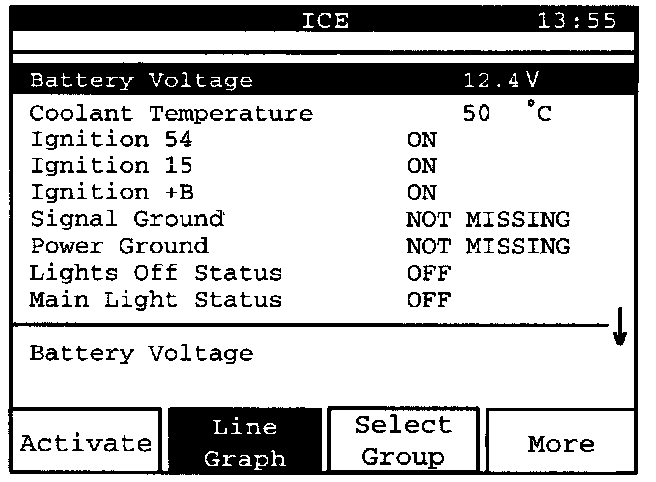 Using the "Line Graph" function, the read values can be shown in graphic form, which is often practical when carrying out fault diagnosis. The read values are also updated faster in "Line Graph" than in list form.
