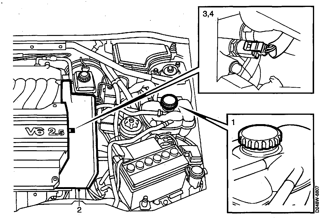 1. Release the pressure in the cooling system by undoing the cap on the expansion tank. Screw the cap back in place.