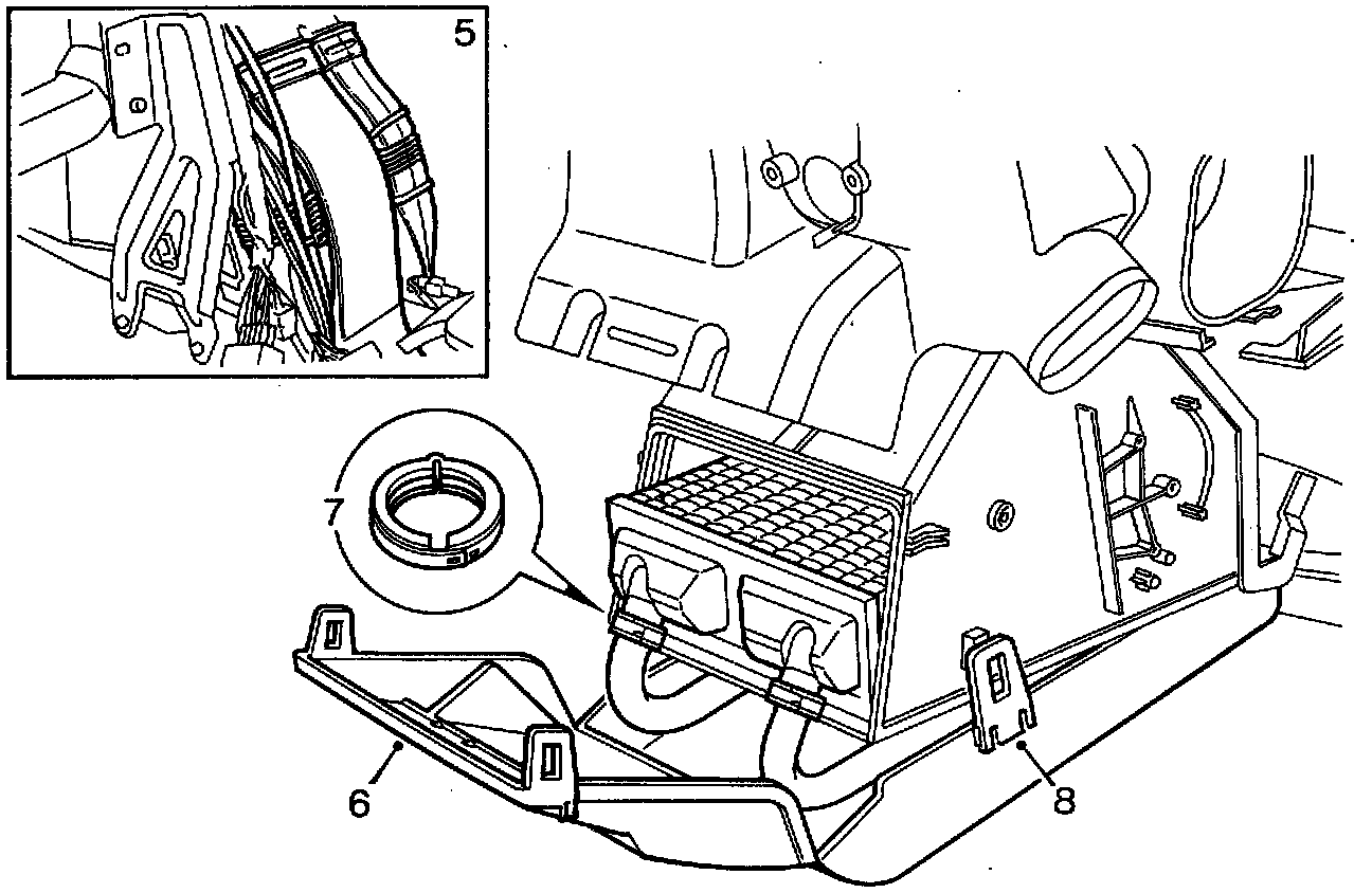 8. Remove the toggle clips on the side of the heater box housing, pull down the hoses and lift out the heater box.