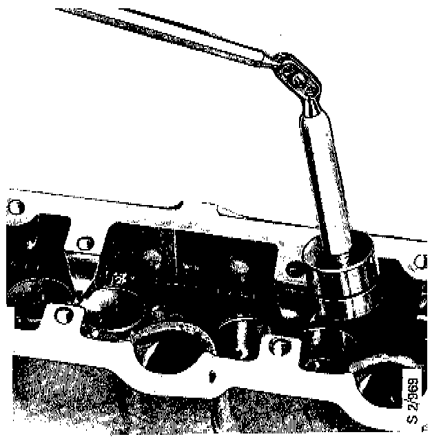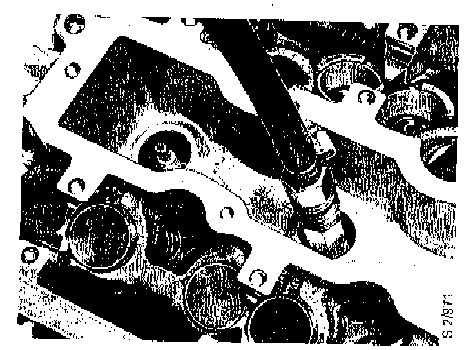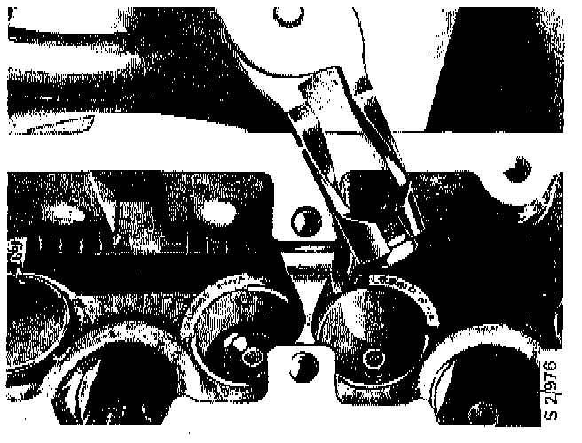 1. Turn the crankshaft to bring the 0° mark in line with the timing mark (top dead center for No. 1 and No. 4 cylinders) and remove the camshafts (all valves are closed in this position). Place a cover over the timing-cover aperture to prevent collets or seals falling inside.