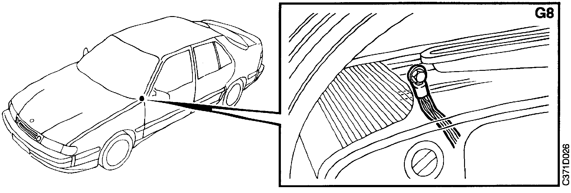 Grounding point G8 is located behind the dashboard under the left-hand speaker grille on the stiffening member. The following components are connected to it: