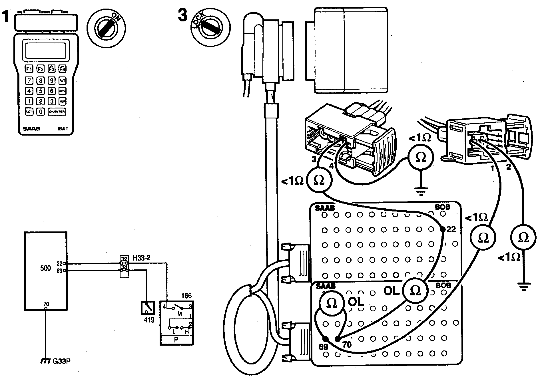 1 Plug in the Intelligent Saab Tester (ISAT) scan tool and select "READ FAULT CODES" from the menu. If any trouble codes are present, continue in Trouble Code Tables.