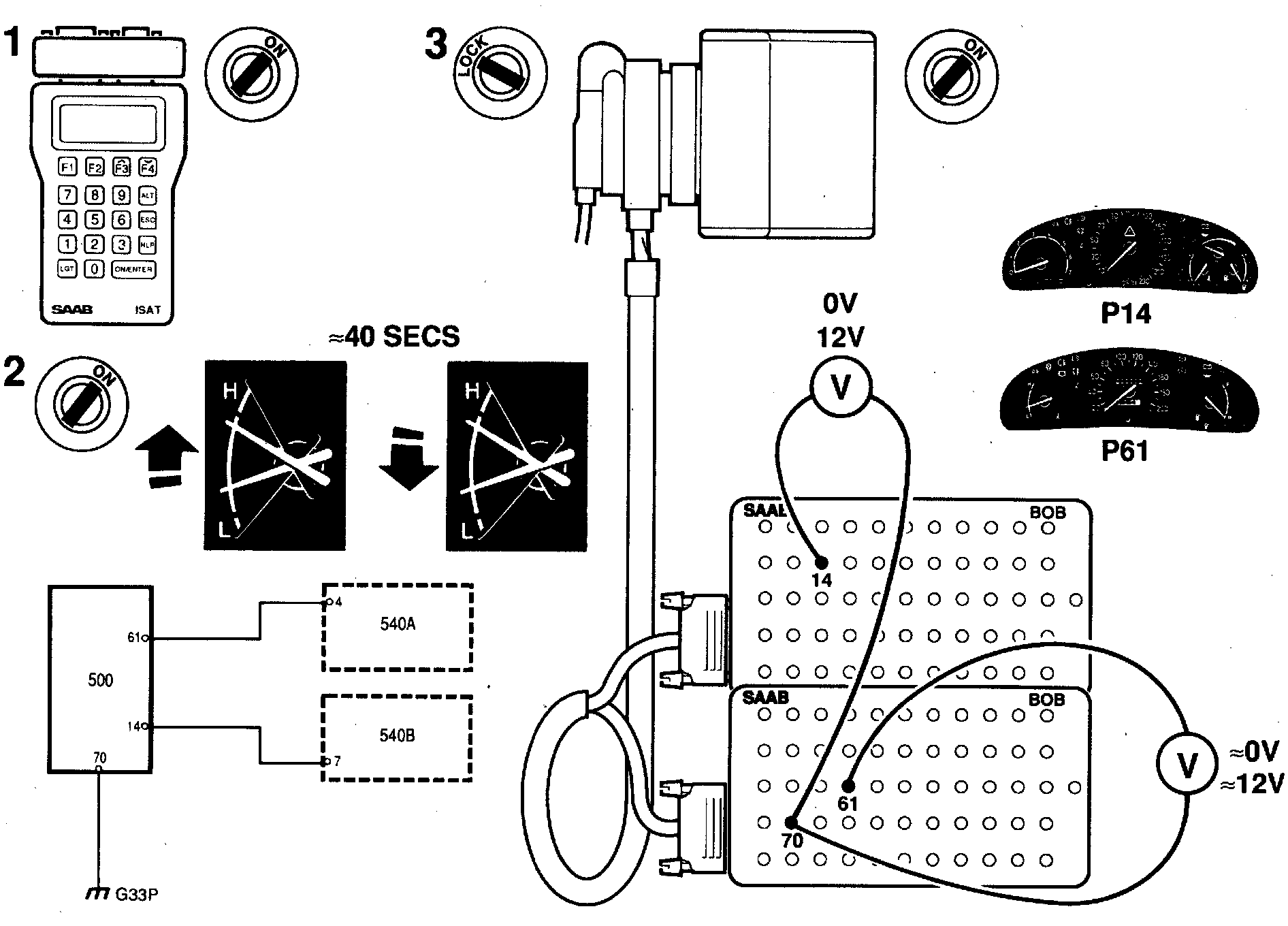 Car equipped with main instrument display panel 1: Plug in the BOB and connect a voltmeter across pins 70 and 61 on the BOB.
