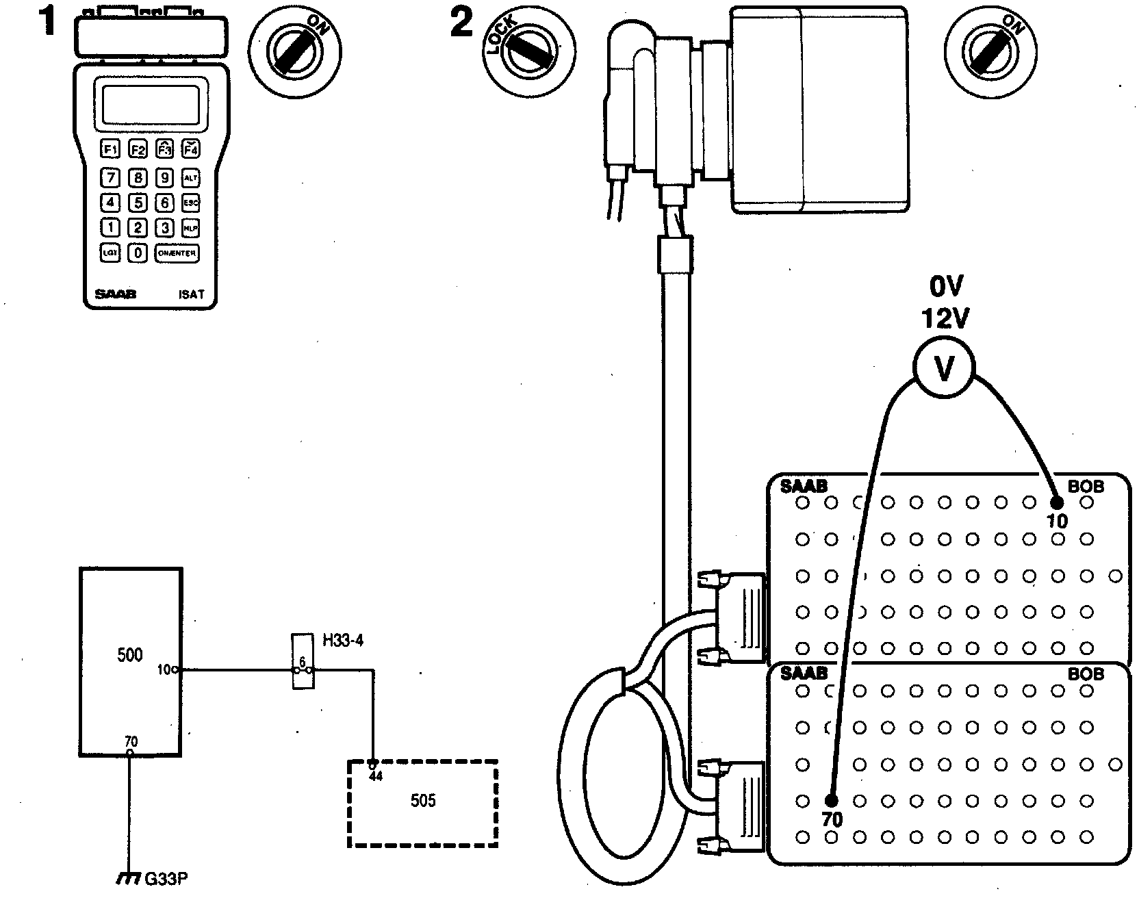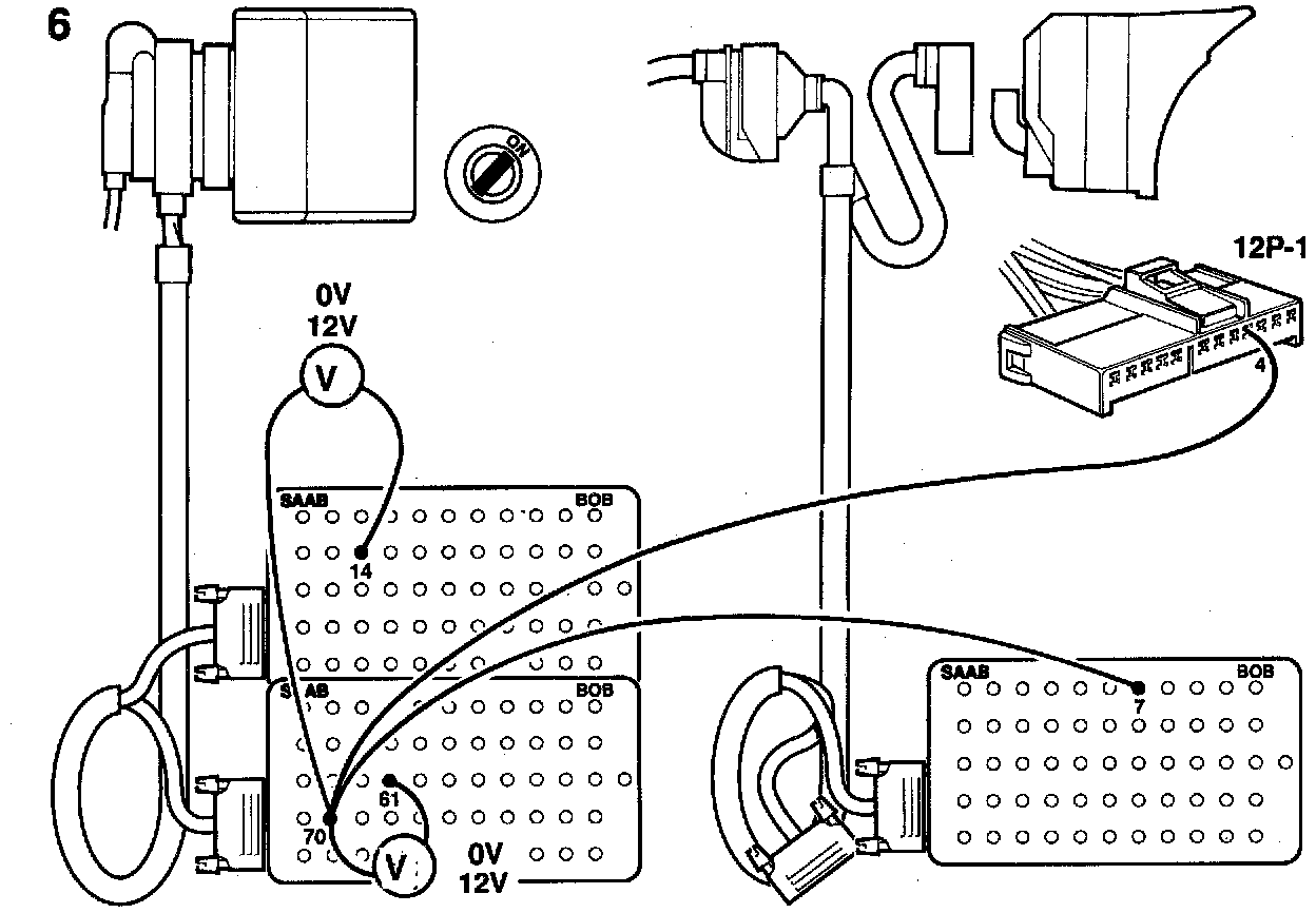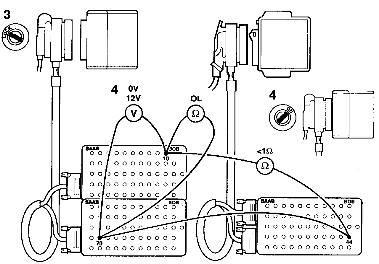 2 Connect a BOB and take voltmeter readings across connector pins 10 and 70. Check the increase in idling speed by selecting "ACT. OTHER FUNCT" from the menu and then "IDLING INCREASE".
