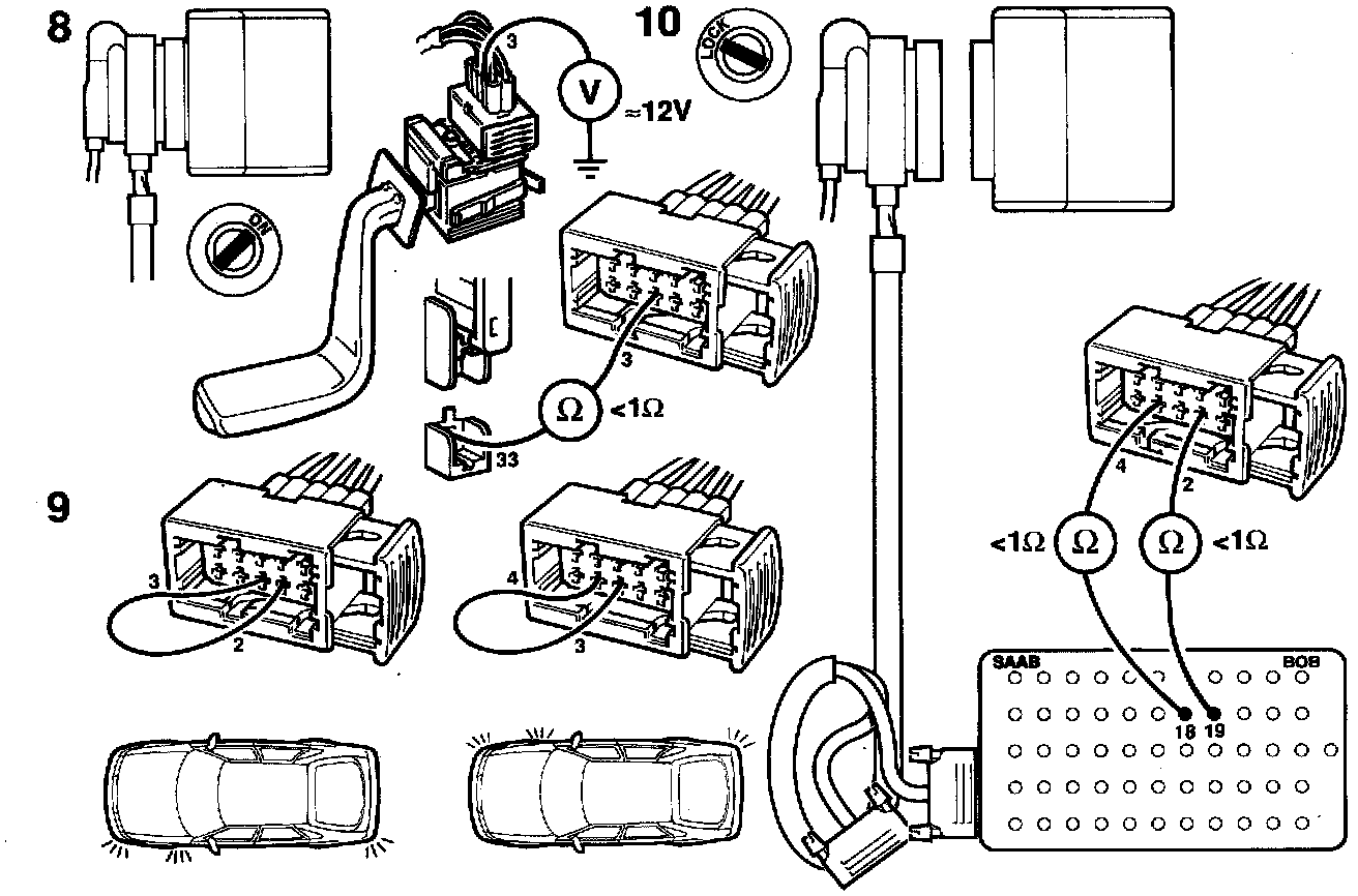8 Check the power supply to the direction indicator switch by taking a voltmeter reading between pin 3 of the switch connector and a good grounding point.