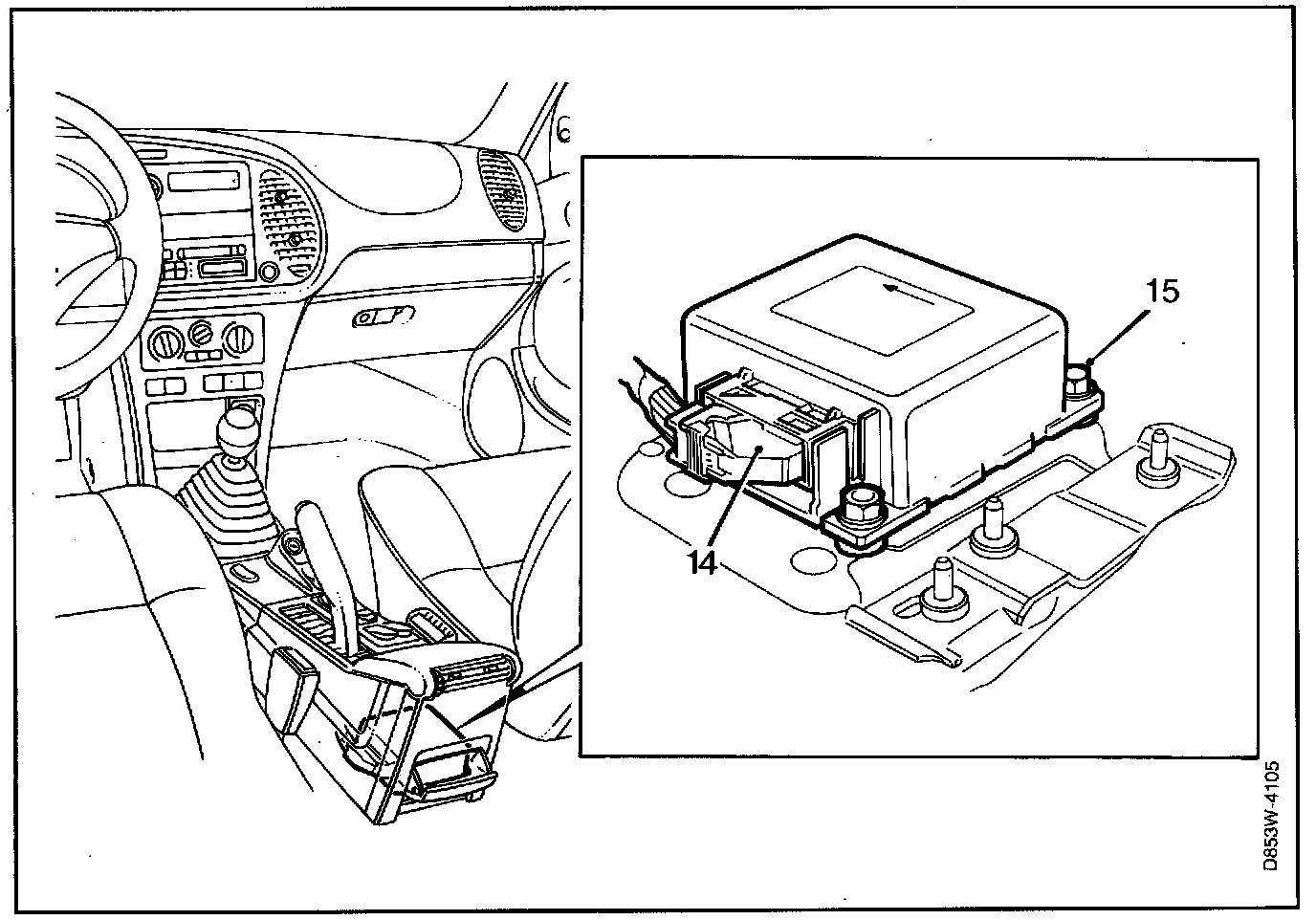 3. Install the floor console over the handbrake. Do not press the console in to position, but let it remain unsecured.