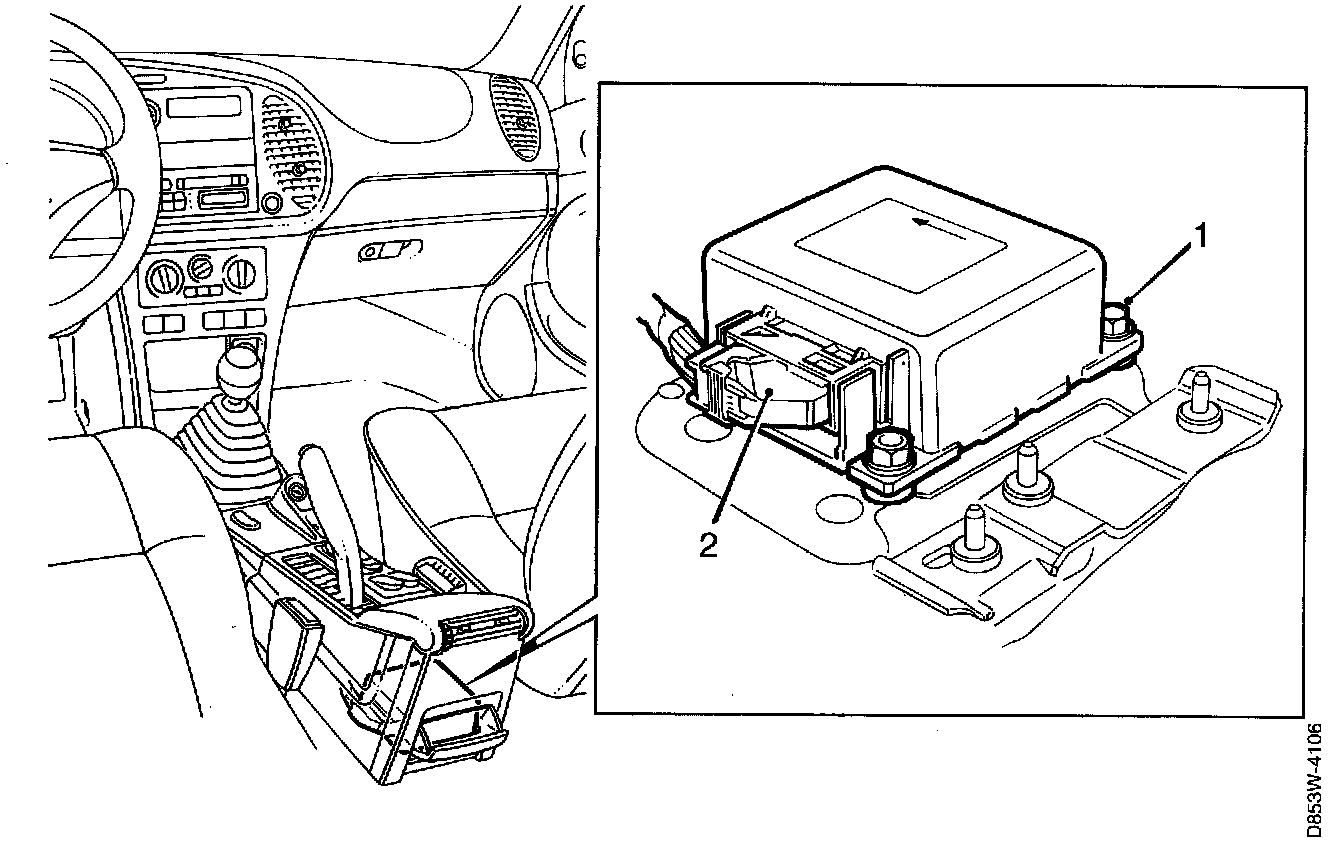 5. Undo the floor console securing screws (2).