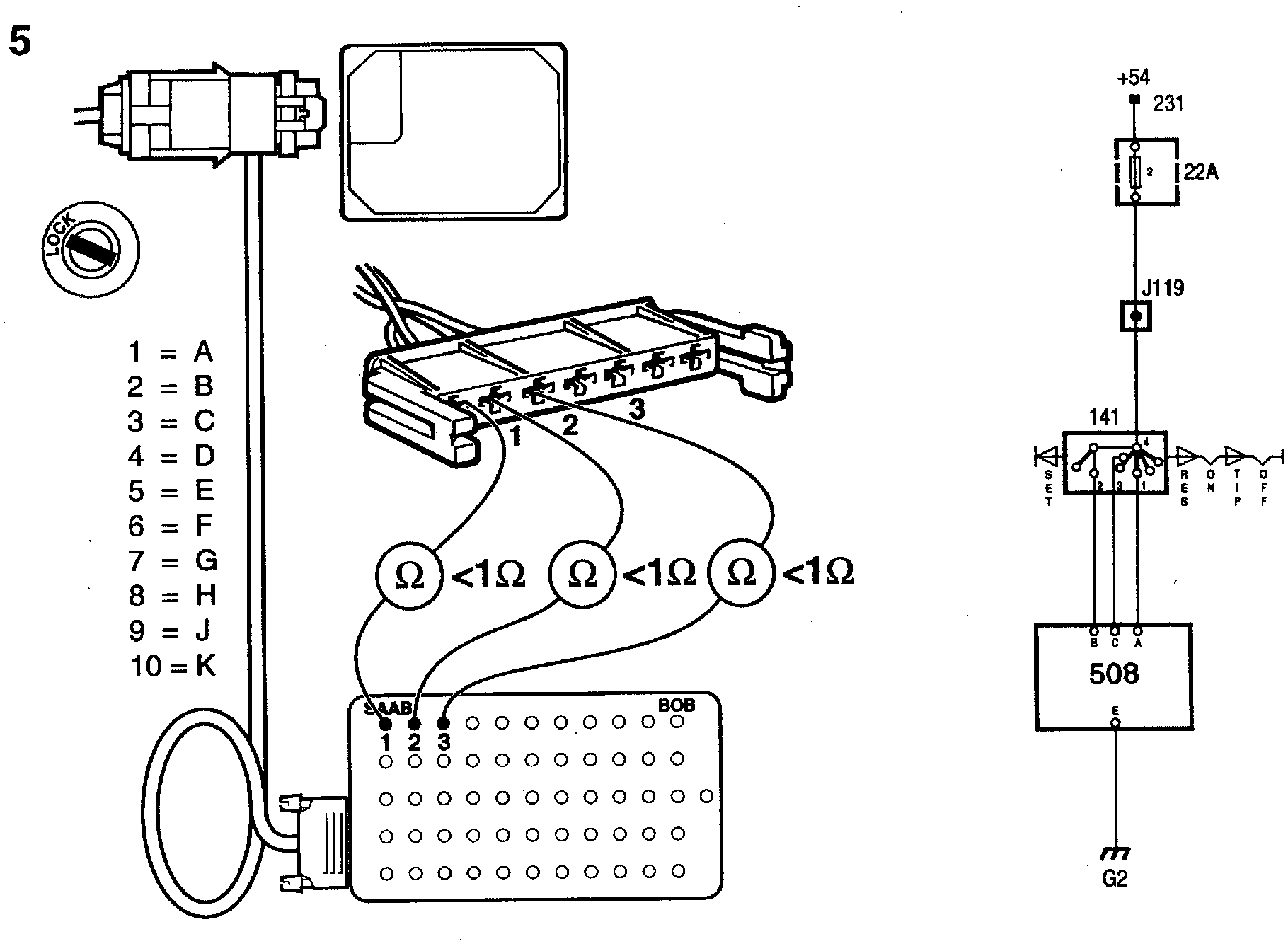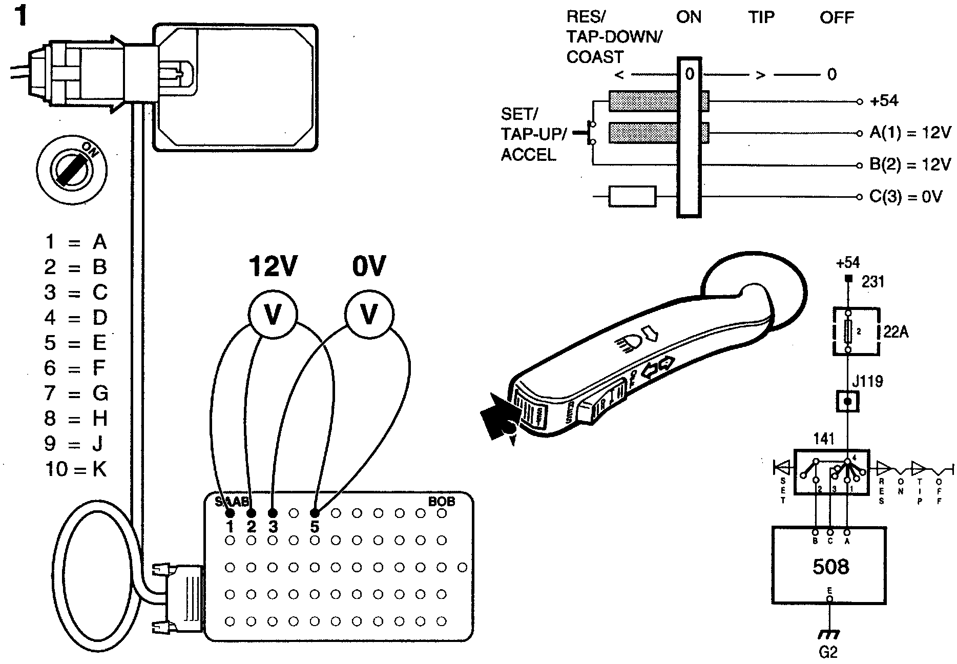 - pin 1 of the switch connector and pin A (1) of the Cruise Control connector.